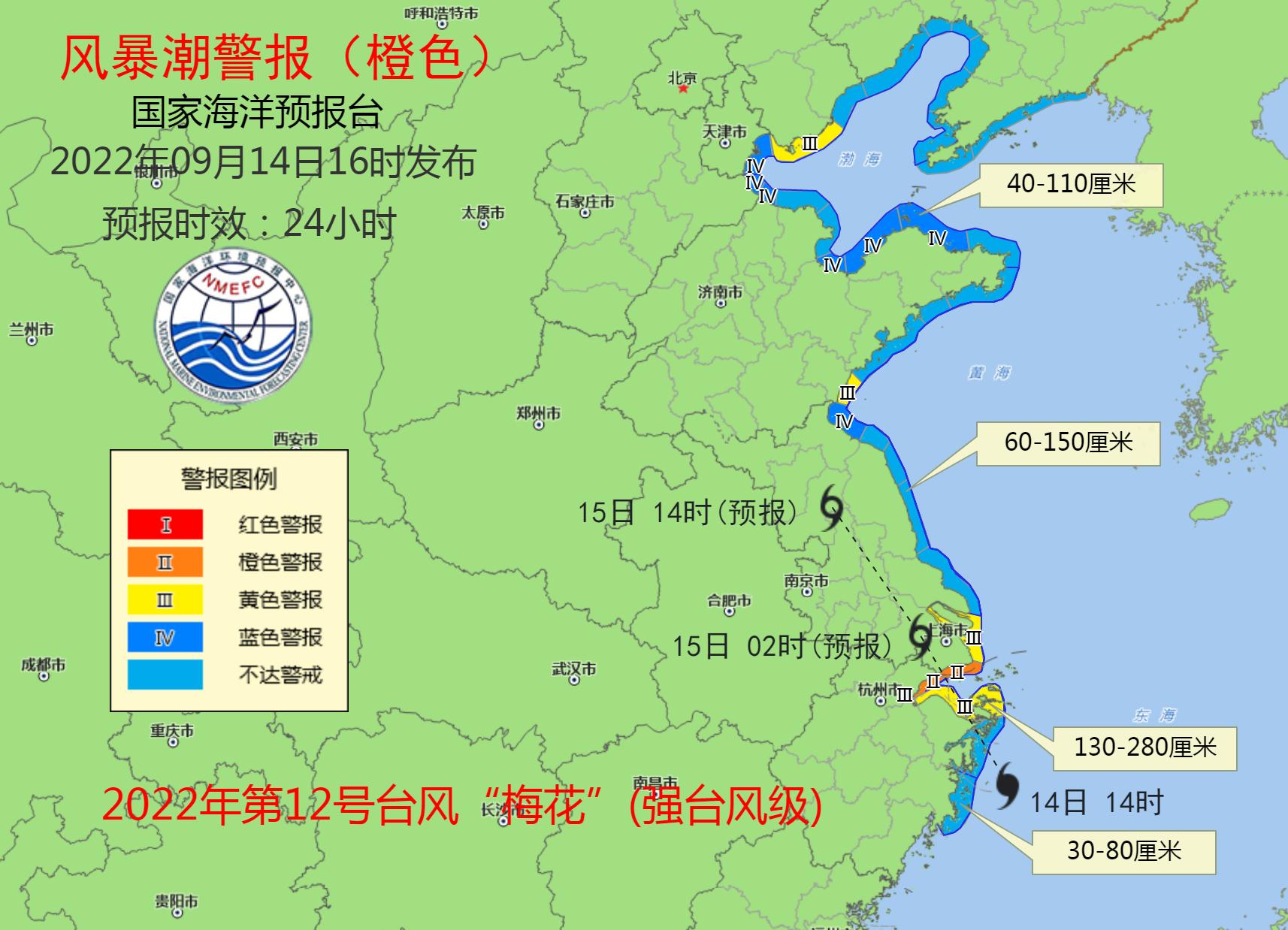 风暴潮方面,预计9月14日下午到15日下午,辽宁至山东半岛北部沿海将出现40到110厘米的风暴潮增水,山东半岛南部至江苏南通沿海将出现60到150厘米的风暴增水,长江口至浙江宁波沿海将出现130到280厘米的风暴增水,浙江台州沿海将出现30到80厘米的风暴增水。