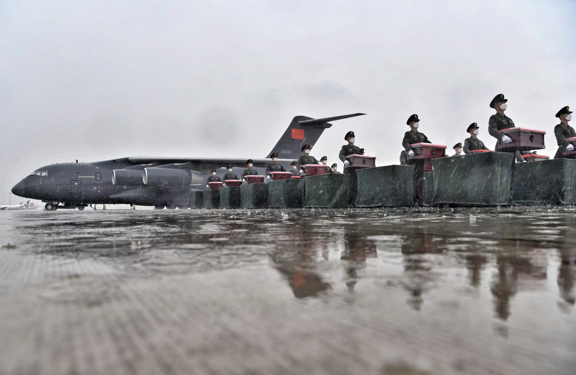 北京时间8时35分,中韩双方在韩国仁川国际机场举行志愿军烈士遗骸交接仪式。11时05分,空军专机降落在辽宁沈阳桃仙国际机场。专机进入中国领空后,空军两架战斗机护航,向志愿军烈士致以崇高敬意,沈阳桃仙国际机场以“过水门”最高礼遇迎接志愿军烈士回家。