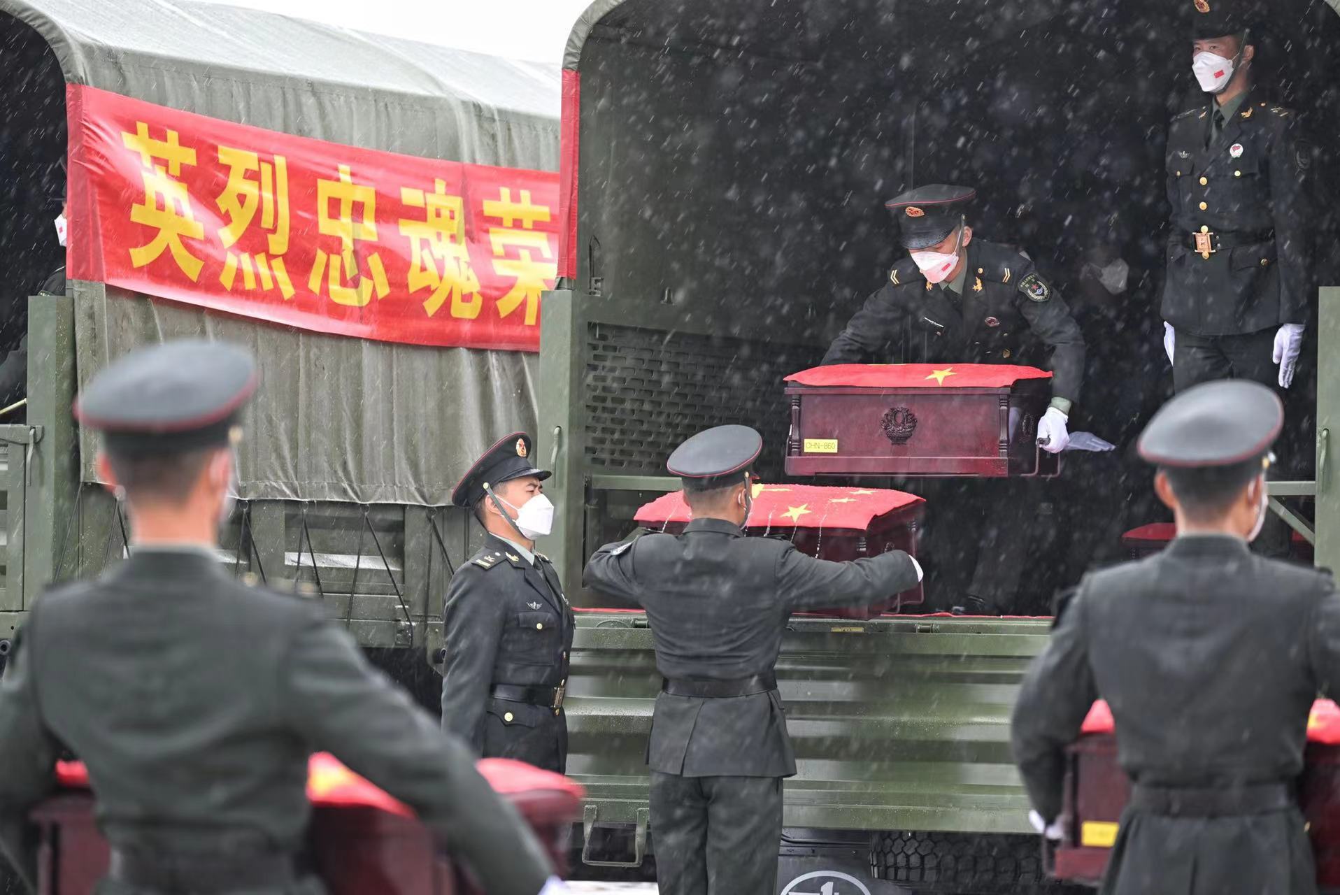 礼兵将烈士棺椁装车。新京报记者 陶冉 摄