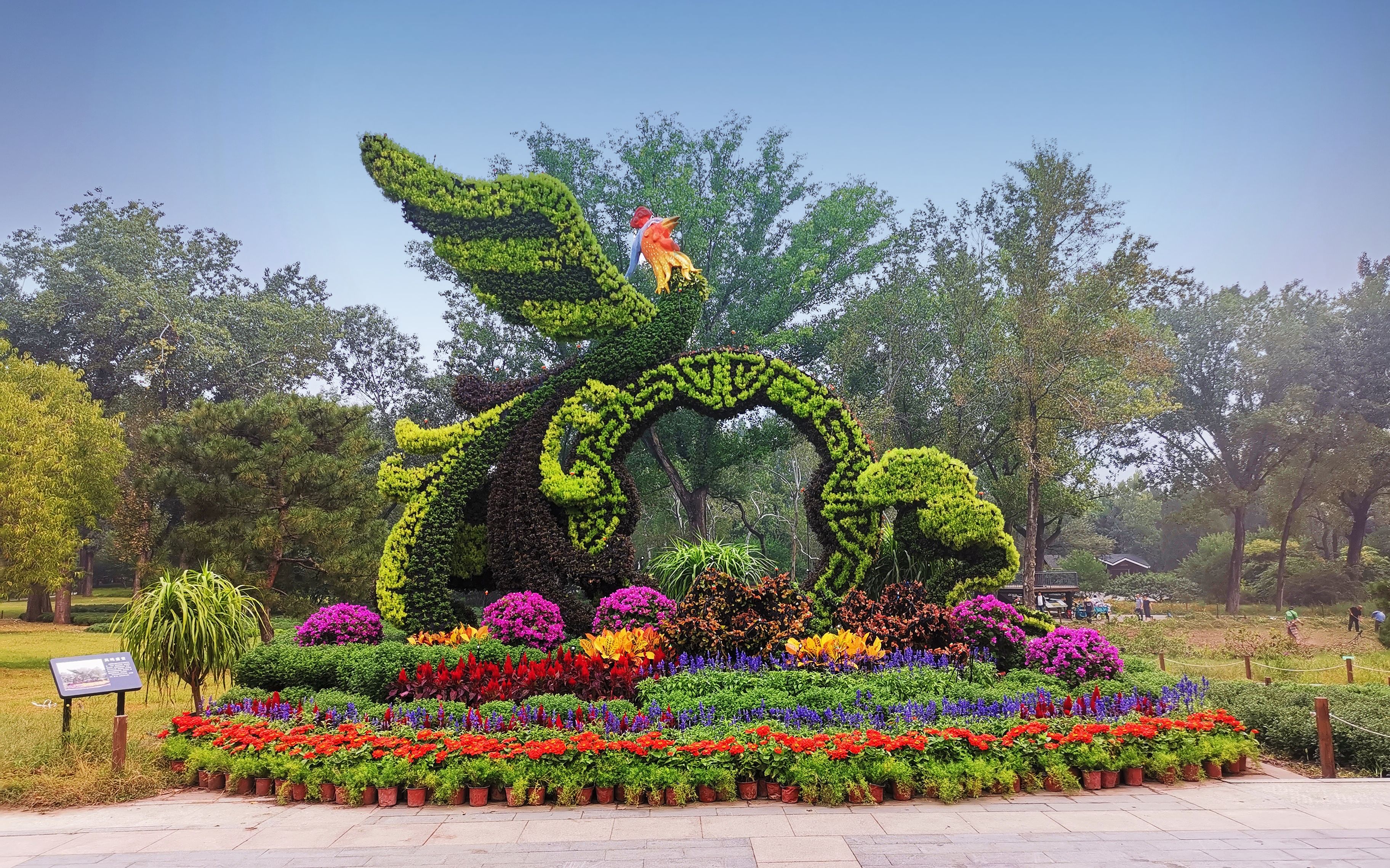 国家植物园(北园)科普馆西侧的“凤鸣盛世”花坛,主体为凤凰造型,地面摆放以菊花为主的应季花卉,打造南门小轴线景观,代表了“龙凤呈祥”的美好寓意。“绘·梦”花坛在北京动物园南门广场呈现,姿态万千的各色花卉错落搭配,模拟山川溪流、大熊猫在花间场景,寓意万物和谐共生,共绘美美与共的美好生活。