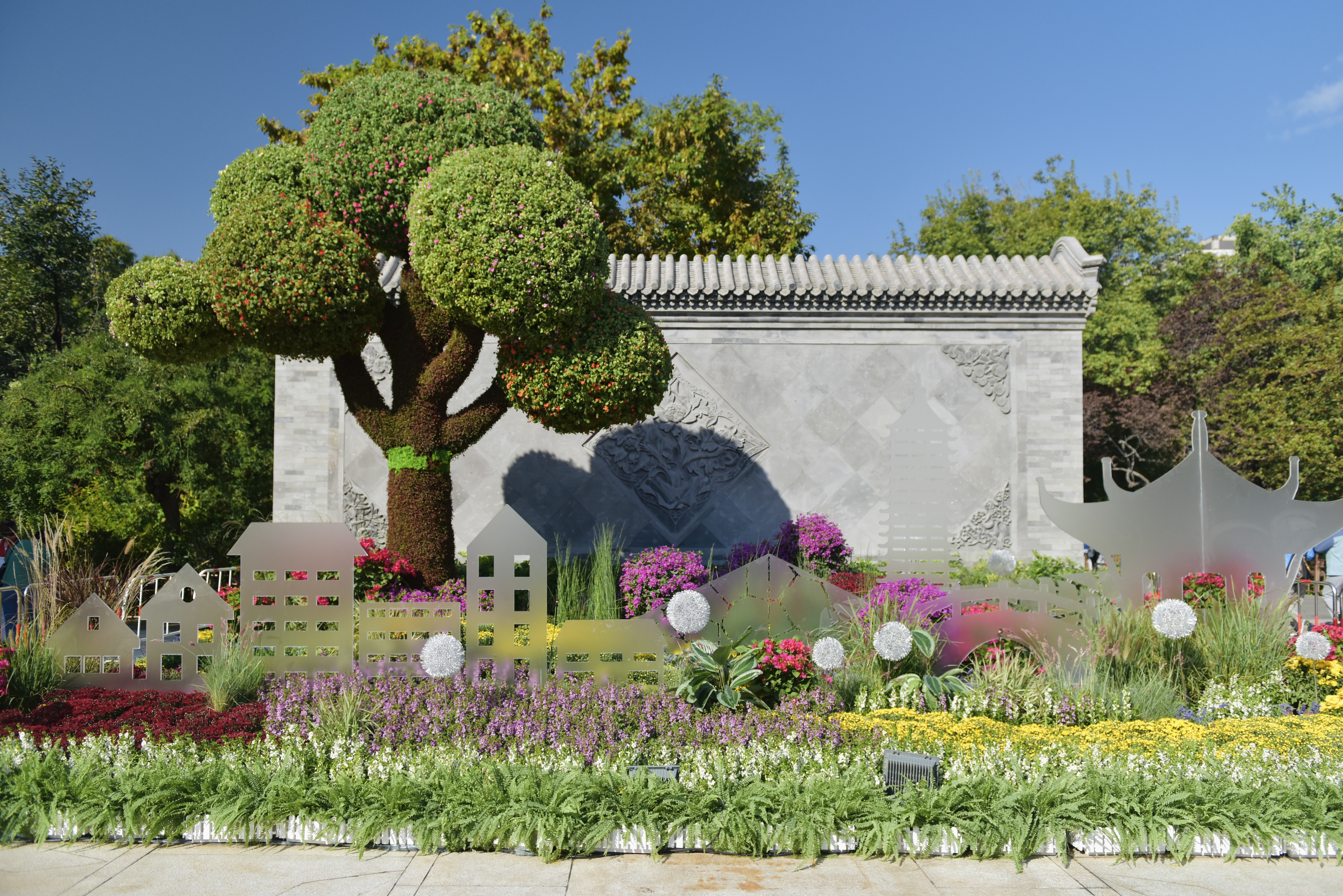 陶然亭公园在东门外摆放“绿色的希望”花坛,体现“人与自然和谐共生”的理念,半透明的“城市建筑”剪影错落掩映在花丛、绿植当中,寓意着中国正在实践现代生态城市的建设。