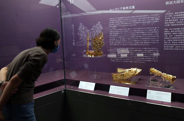 9月23日,清华大学艺术博物馆,嘉宾观看日本古坟时代末期(公元6世纪)的鎏金铜履和鎏金铜制筒形器(复制品)。本次特展共展出奈良县立橿原考古研究所等机构的100余件套与中国相关的文物,以及国内文博机构所藏的数十件与日本相关的文物。展览分为“倭人的姿态”“倭国与中国”“日本国的成立”“祈祷的样态”“大和的地宝”“中国视角的日本”六个单元,包含了诸多首次出境日本的珍贵文物。