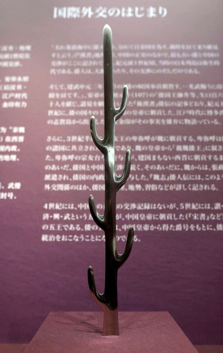 东晋制造的古坟时代(公元4世纪)七支刀(复制品),根据石上神宫流传下来的神宝“国宝七支刀”复原制作。据《日本书纪》神功皇后五十二年条记载,原件是由百济进献而来。这把七支刀可能是东晋太和二年(369)百济王及其世子赠予倭王的。