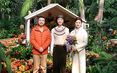 游客在“祝福祖国”国庆花果篮前自拍留影。