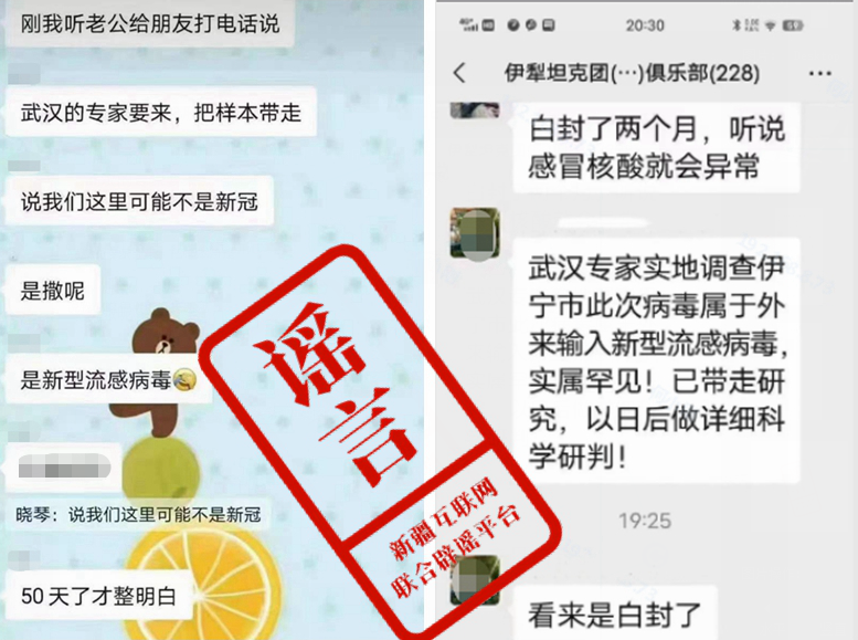 新京报讯 据新疆网络辟谣消息,接网民举报,近日有网民在微信群圈、微博、抖音等平台以短视频、图片或文字等形式散布“武汉专家实地调查伊宁市此次病毒属于外来输入新型流感病毒”等虚假信息及类似变种样本。经与有关部门核实查证,上述信息为网络谣言。