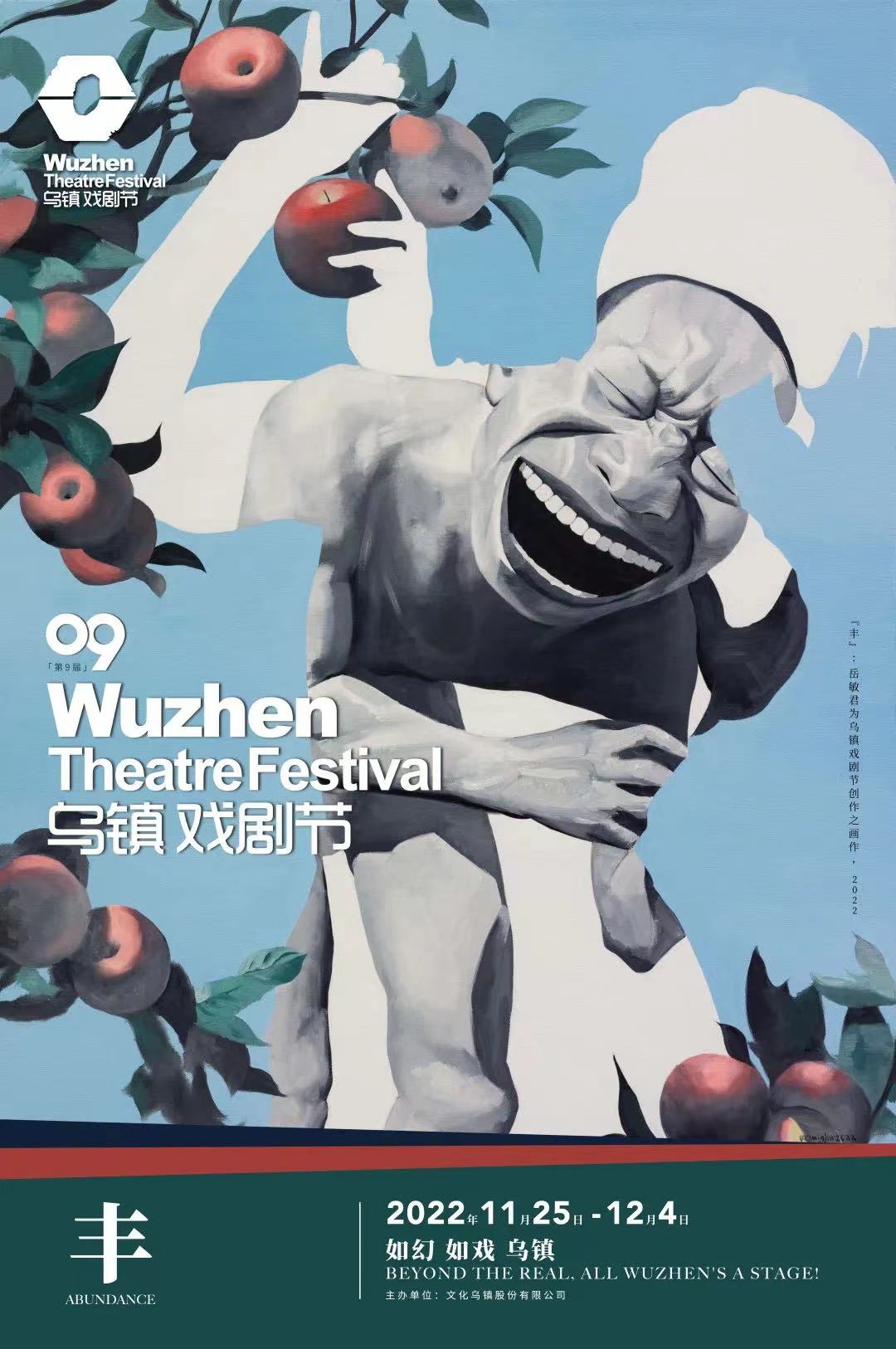 第九届乌镇戏剧节以“丰”为主题——顺逆皆境,丰俭由人,不问收获,志在耕耘,秉承耕耘之心,持续开拓戏剧之土壤。值得关注的是,中国当代艺术领军人物、国际著名艺术家岳敏君为第九届乌镇戏剧节创作了主视觉画作。画作中的苹果结合人物剪影的形象,立意于丰收与幸福、冒险与创造的主题,人生像是一出戏剧,从摘苹果的时刻转换到时过境迁的眼下,充满吸引人的情节。
