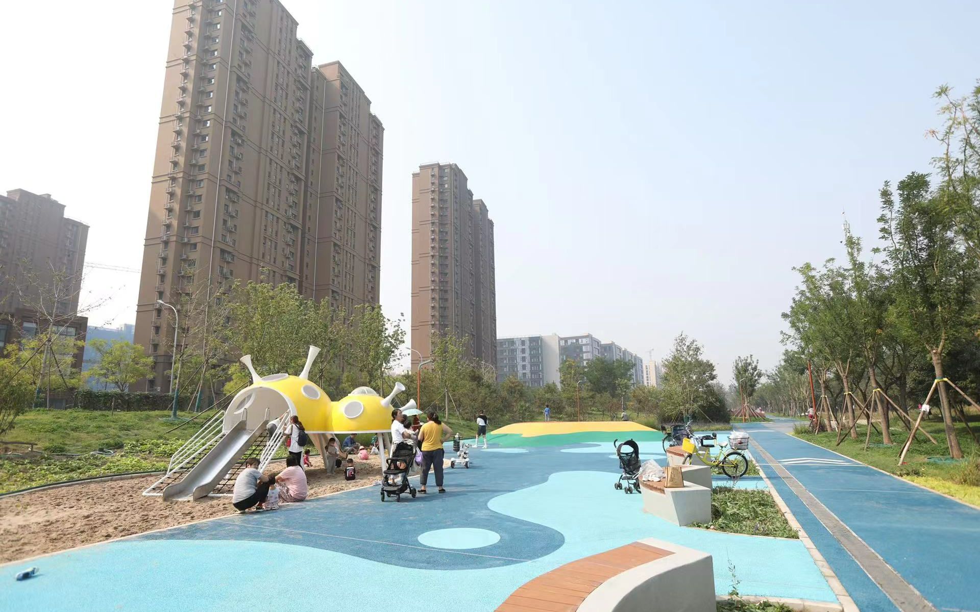 坝河滨水空间的儿童游戏区铺设了彩色地面。新京报记者 王飞 摄