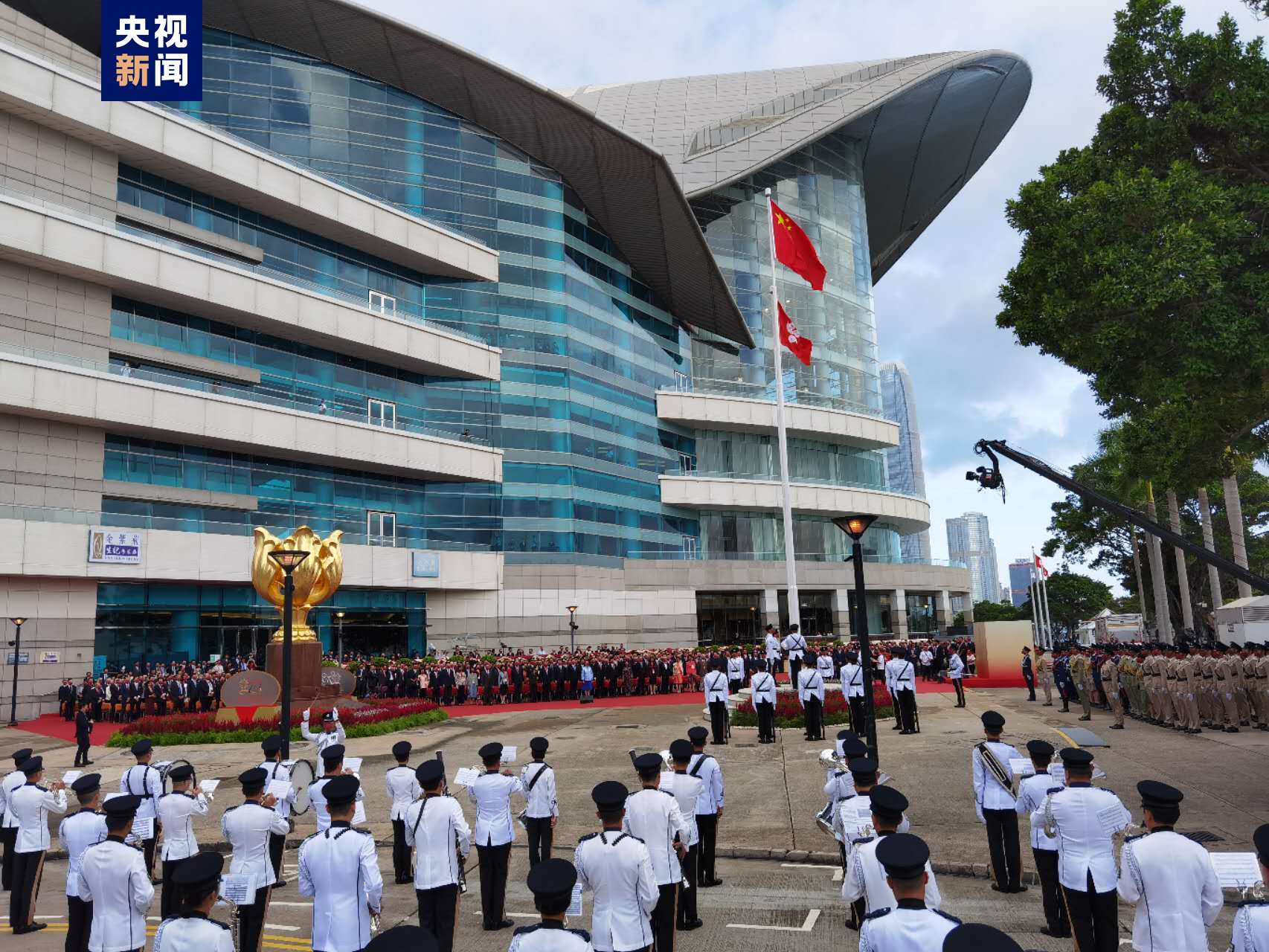 升旗仪式上午8时在金紫荆广场举行。全国政协副主席梁振英、香港特区行政长官李家超、中央驻港机构负责人,以及终审法院首席法官、特区政府主要官员和社会各界知名人士等出席。