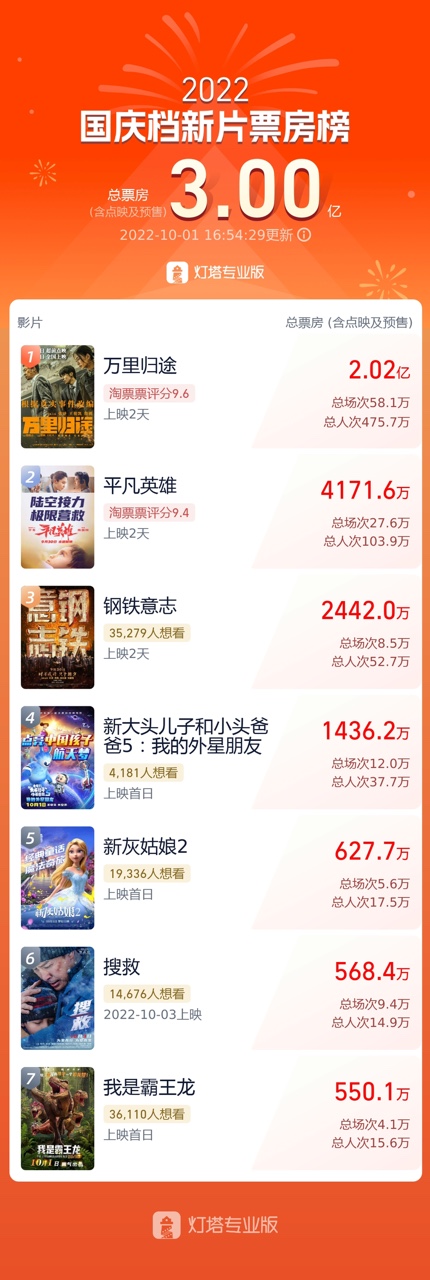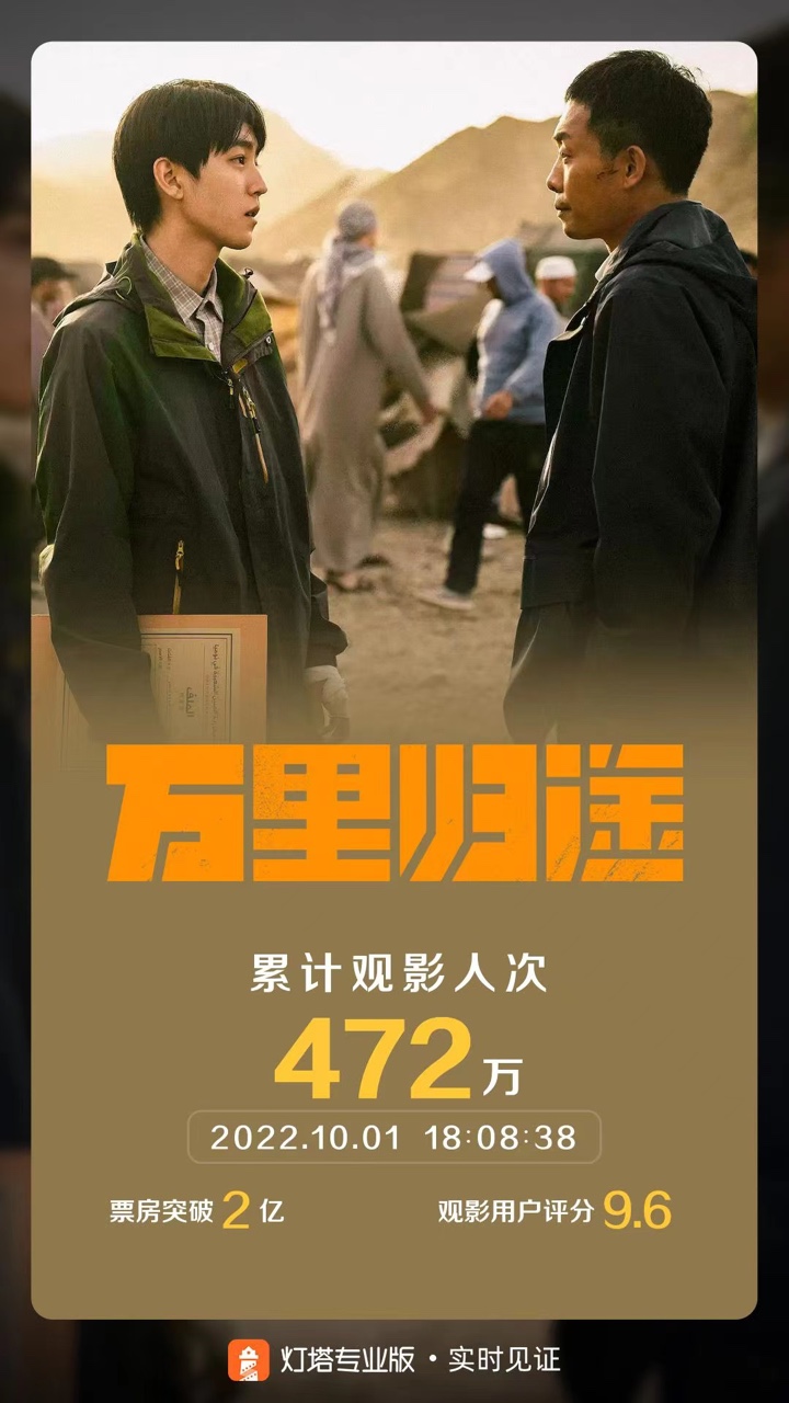 2022国庆档新片总票房破3亿,《万里归途》破2亿