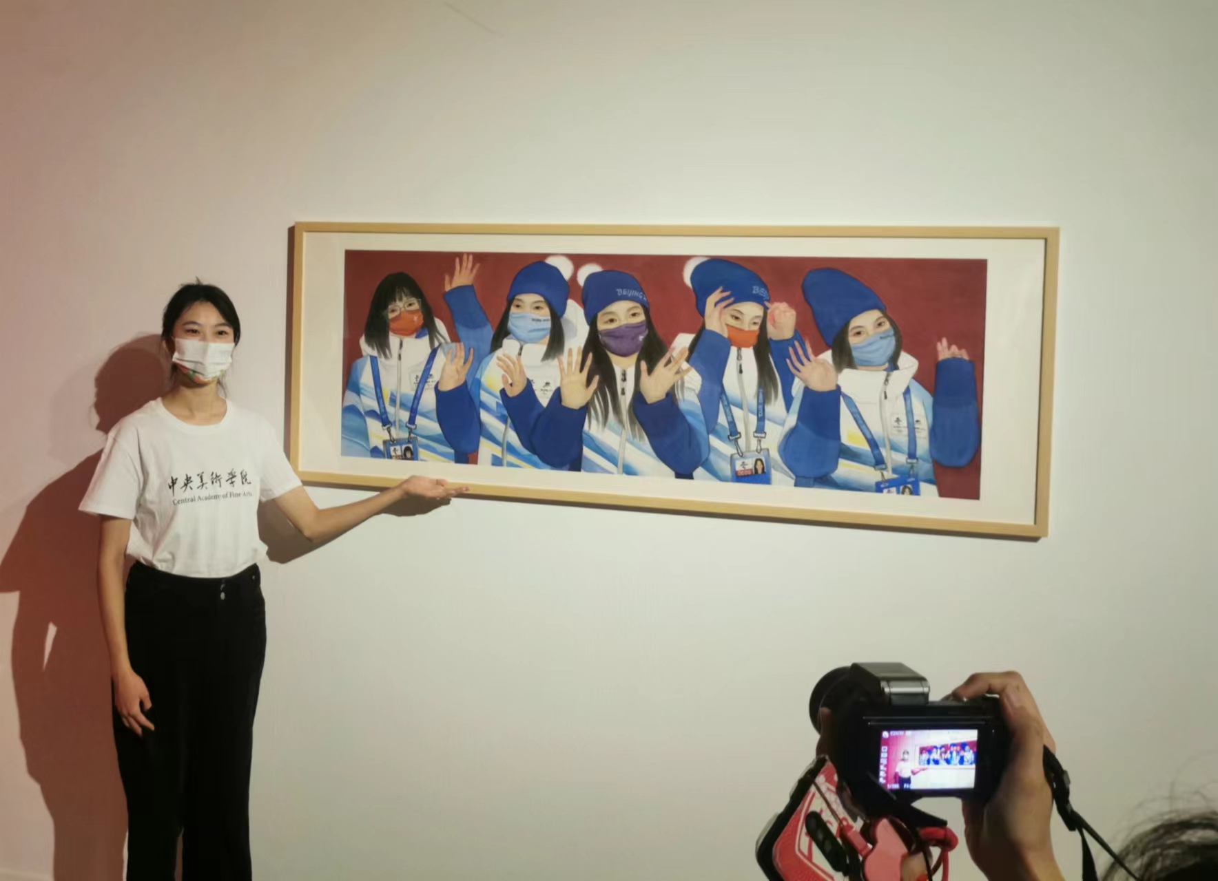 此次展览中,中央美术学院中国画工笔人物专业大四学生王昭的入选作品名为《一起向未来》。王昭参加了北京2022年冬奥会和冬残奥会志愿服务工作,她以美院人的方式用画笔记录眼中的时代家国,传递冬奥精神。