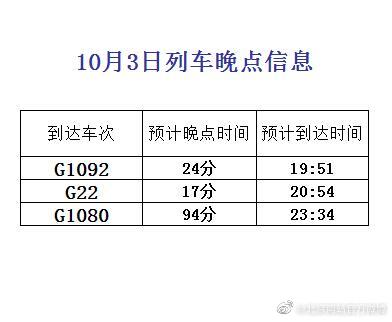 新京报讯 据北京南站官方微博消息,受济南地区降雨影响,北京南站部分到达、始发列车有不同程度晚点。截至目前,具体晚点情况信息如下,请广大旅客及时关注12306官方信息和车站公告。