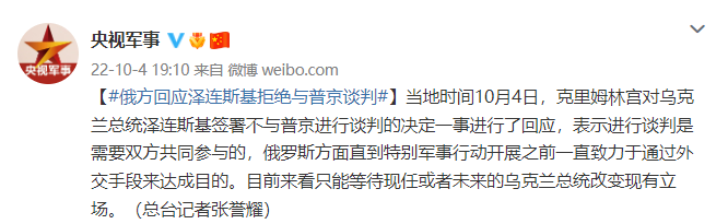 据@央视军事消息,当地时间10月4日,克里姆林宫对乌克兰总统泽连斯基签署不与普京进行谈判的决定一事进行了回应,表示进行谈判是需要双方共同参与的,俄罗斯方面直到特别军事行动开展之前一直致力于通过外交手段来达成目的。目前来看只能等待现任或者未来的乌克兰总统改变现有立场。(总台记者张誉耀)