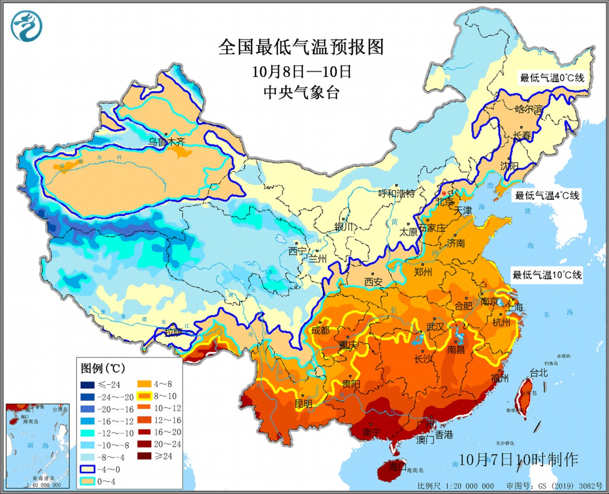 8日至10日,中东部大部地区气温将普遍下降4~8℃,其中甘肃中部、陕西北部、山西北部、内蒙古中部、苏皖北部等局地降温幅度可达10~12℃。最低气温0℃线位于陕西北部、山西北部、北京北部至东北地区西部一带;与上次寒潮过程相比,最低气温0℃线西段位置更偏南。