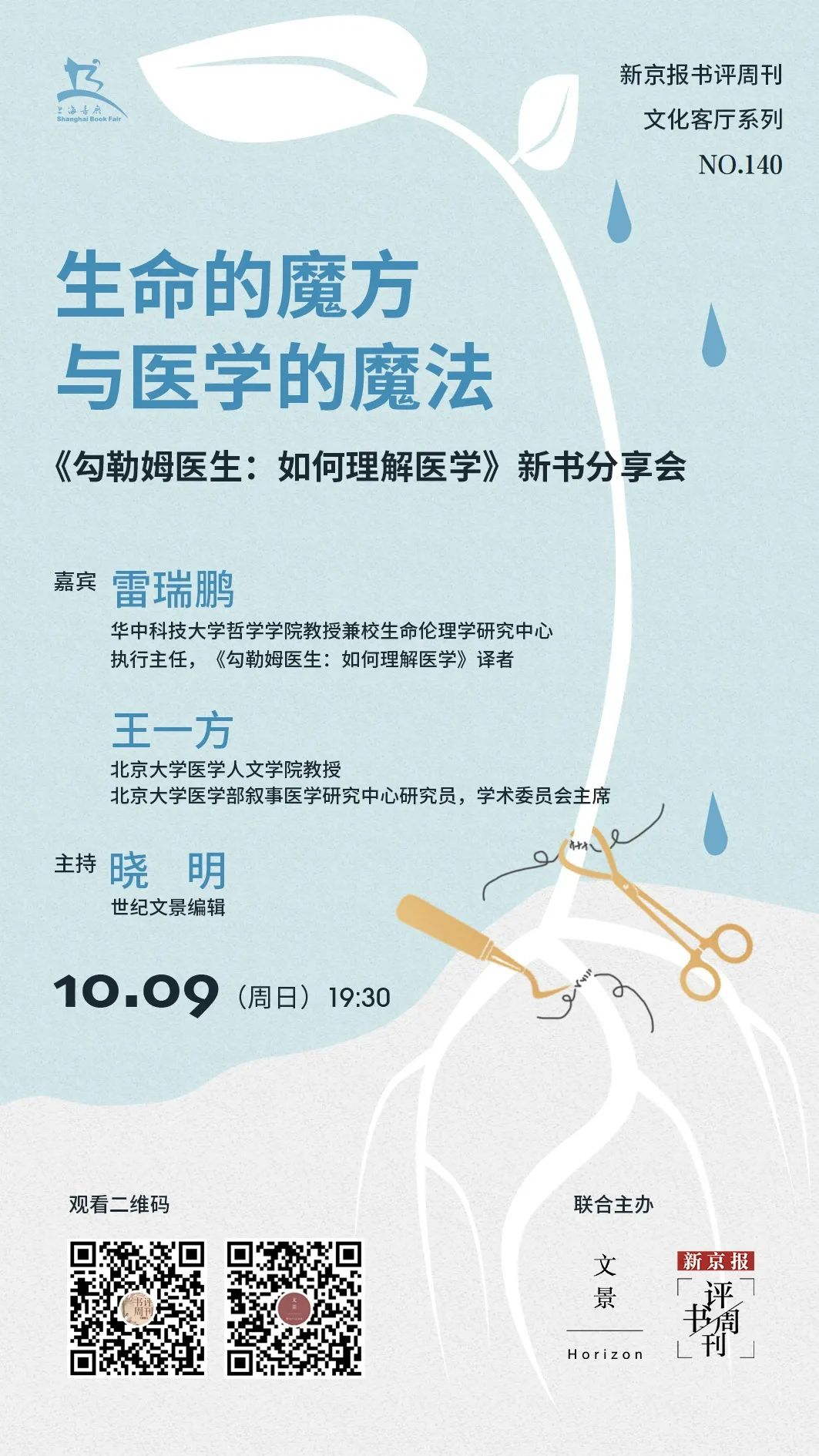 面对不完美的医学,我们如何与医生携手面对病痛?10月9日(周日)19:30,新京报书评周刊·文化客厅系列活动第140场,我们联合世纪文景,邀请华中科技大学哲学学院教授兼校生命伦理学研究中心执行主任雷瑞鹏、北京大学医学人文学院教授兼北大医学部叙事医学研究中心学术委员会主席王一方,共谈生命的魔方与医学的魔法。