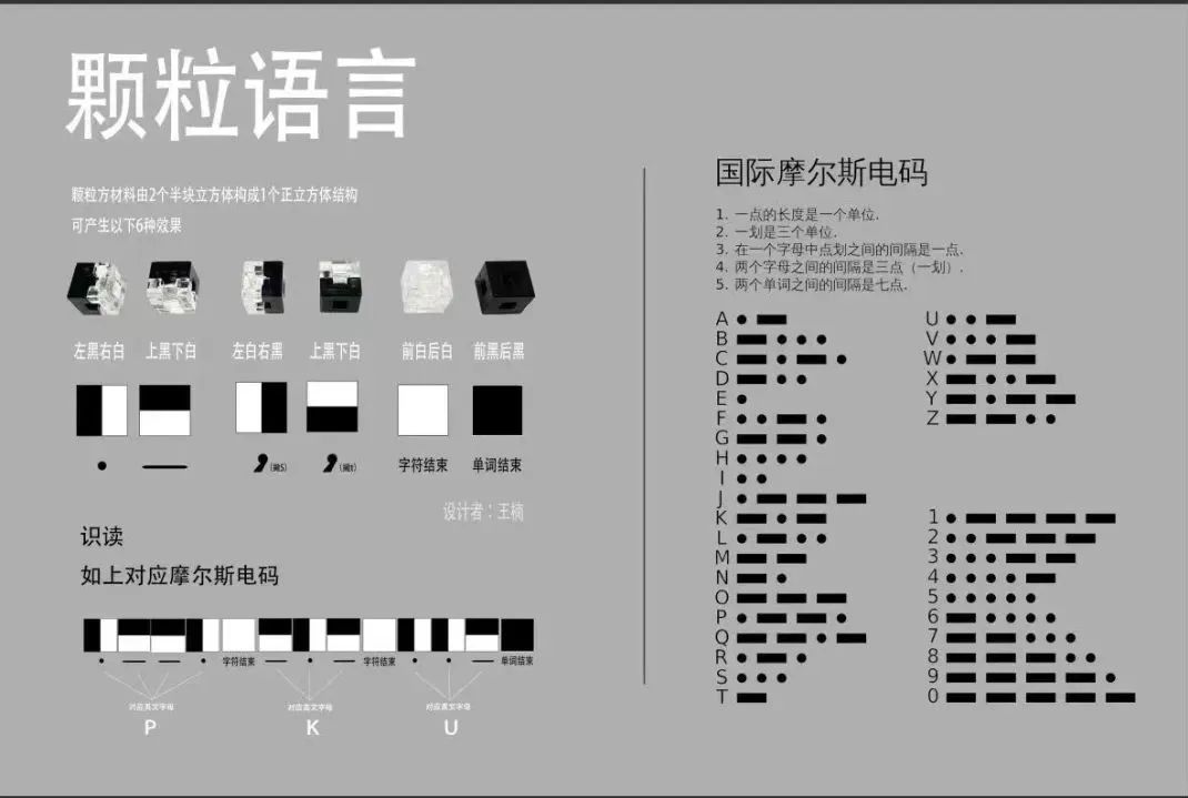 与首届颗粒艺术展相比,此次展览体现了更多和计算机结合的作品,同时也正式发布了颗粒语言,并将其与国际摩尔斯电码相对应,使其可以识读。
