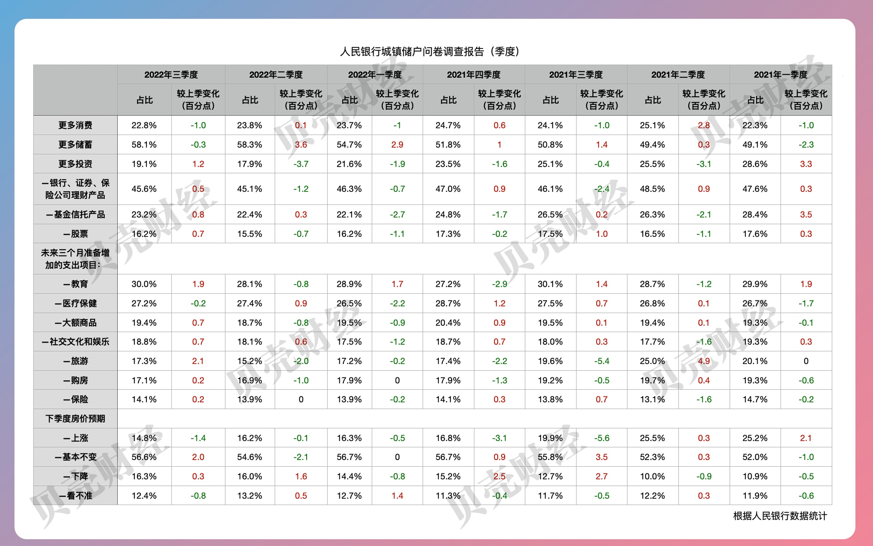 “储户储蓄意愿略有下降,与银行存款利率下降有关,也与对市场回暖信心复苏有关。”周茂华表示,今年以来银行存款利率进入下行通道,存款收益已经处于较低水平。但从总体来看,资本市场将在四季度或迎来上行行情,因此选择更多投资的居民占比小幅增长亦在情理之中。