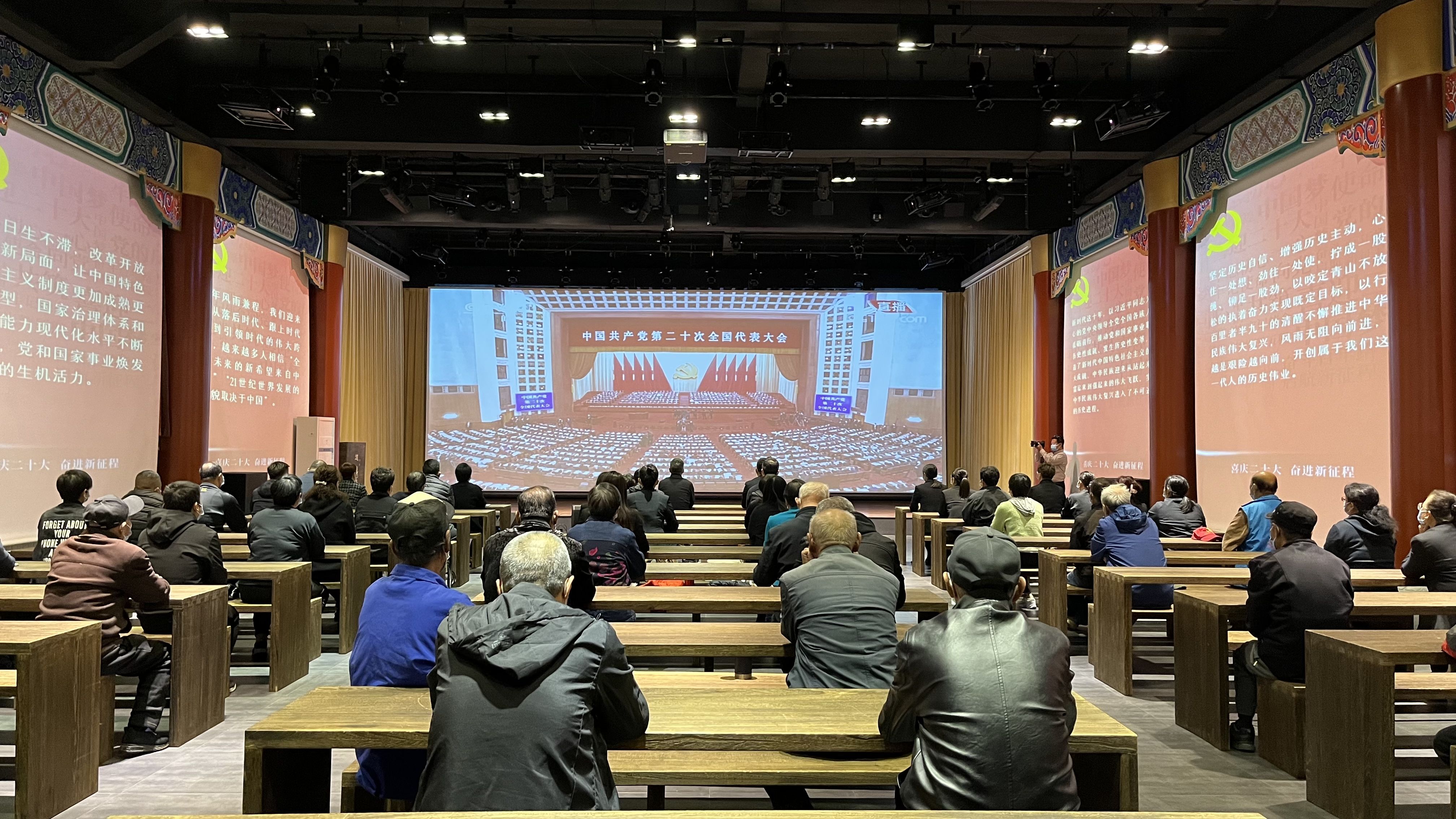 新京报讯(记者耿子叶 通讯员刘飞)10月16日,在朝阳区高井村,大街小巷五星红旗迎风飘扬,处处洋溢着喜迎二十大的浓厚氛围。在村里的道德讲堂内,党员干部、有着50年党龄的老党员以及志愿者等,在一起观看中国共产党第二十次全国代表大会开幕会直播。