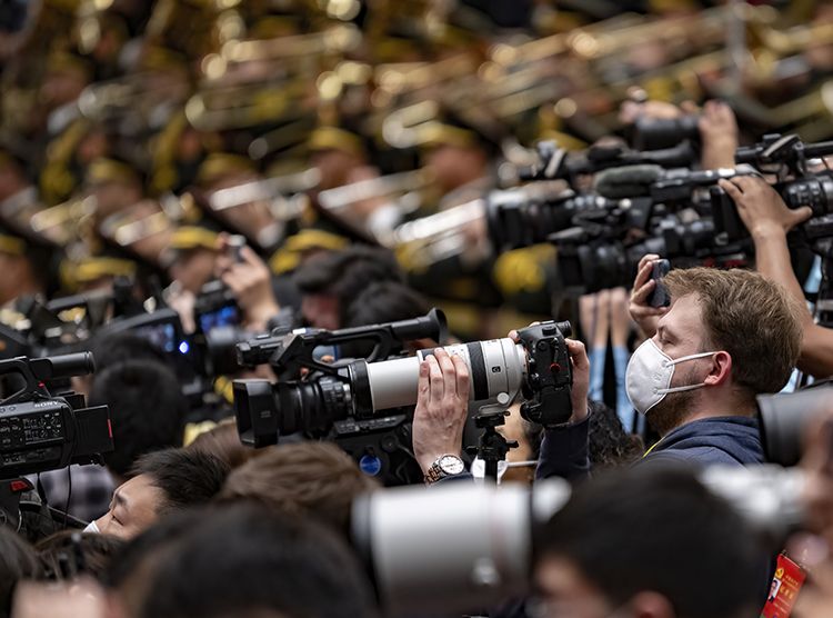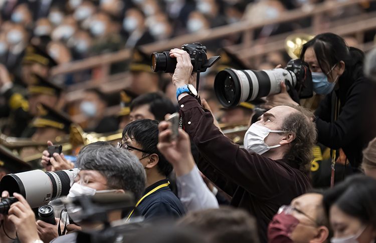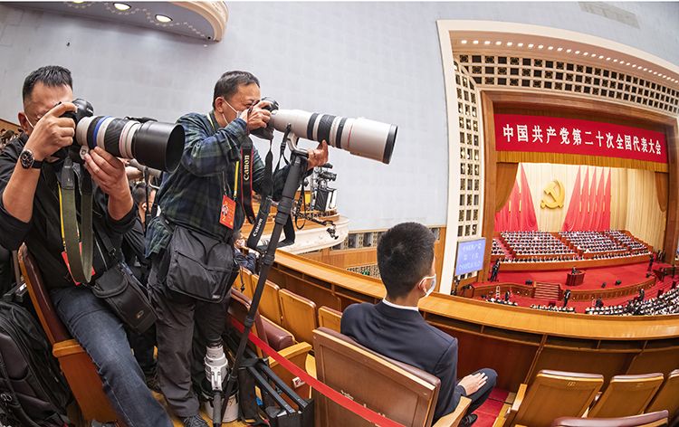 10月16日,中国共产党第二十次全国代表大会在北京人民大会堂开幕,中外媒体聚焦开幕会盛况。大会将全面总结中国改革发展取得的重大成就和宝贵经验,全面把握新时代新征程中国事业发展新要求、人民群众新期待,制定行动纲领和大政方针。国际社会高度关注中国共产党第二十次全国代表大会为中国未来发展制定出的路线图,以及中国新发展为世界和平与发展和人类文明进步提供的新启迪、新动力。图为:记者在人民大会堂拍摄开幕会盛况。