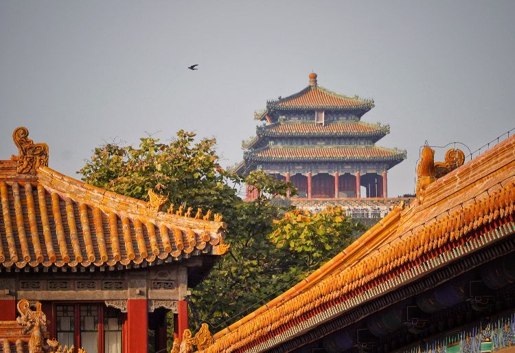 10月19日,故宫,鸟儿飞过红墙黄瓦。