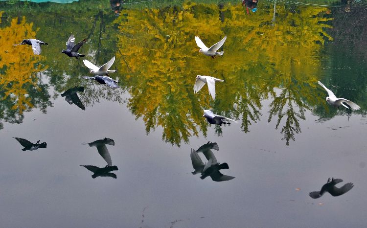 10月20日,望和公园北园,一群鸽子飞过水面。