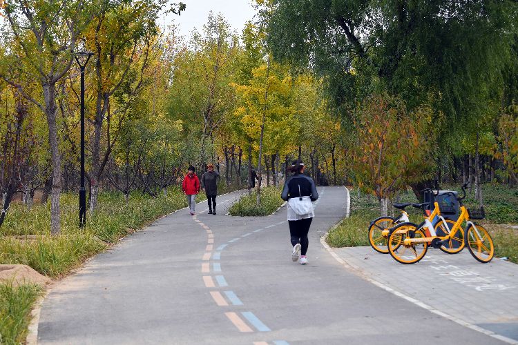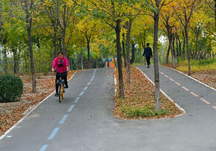 10月20日,望和公园北园,“朝阳绿道”两侧树叶已变黄,骑行爱好者一路秋色相伴。日前,朝阳绿道示范段在高德地图上线。朝阳区北部绿道9.5公里示范段从温榆河公园一路向南,经奥森、过望京、南至朝阳公园、红领巾公园,东至朝阳站,一路林荫相伴。