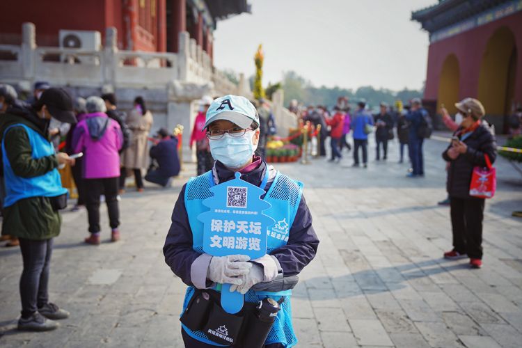 10月21日,天坛公园,志愿者提醒游客文明游园。