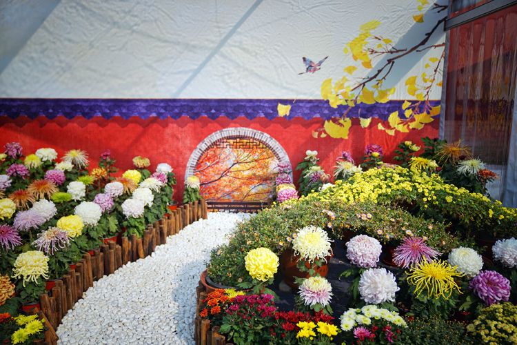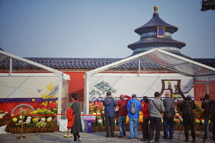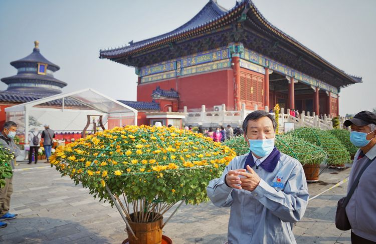 作为北京菊花文化节的分会场,本届天坛公园菊花展以“古坛四时景 红墙映黄华”为主题,展示了中国传统品种菊花和天坛公园精湛的养菊技艺。