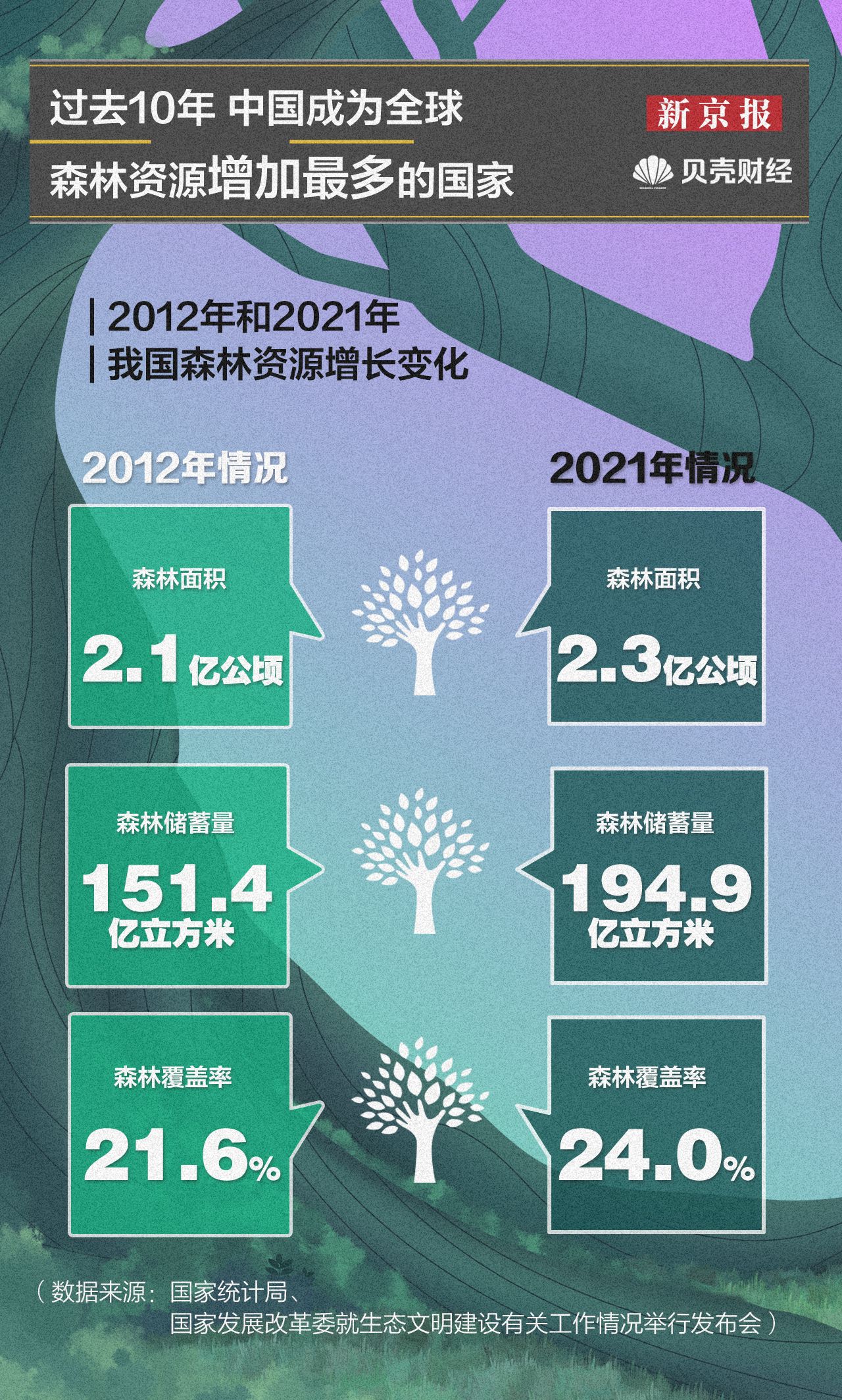 截至2021年,我国累计完成造林9.6亿亩,占全球人工造林的四分之一,森林面积和森林储蓄量连续保持“双增长”,成为全球森林资源增加最多的国家。2021年,我国森林面积达约2.3亿公顷,森林储蓄量达194.9亿立方米,相比2012年增长28.8%,森林覆盖率提高2.4个百分点。