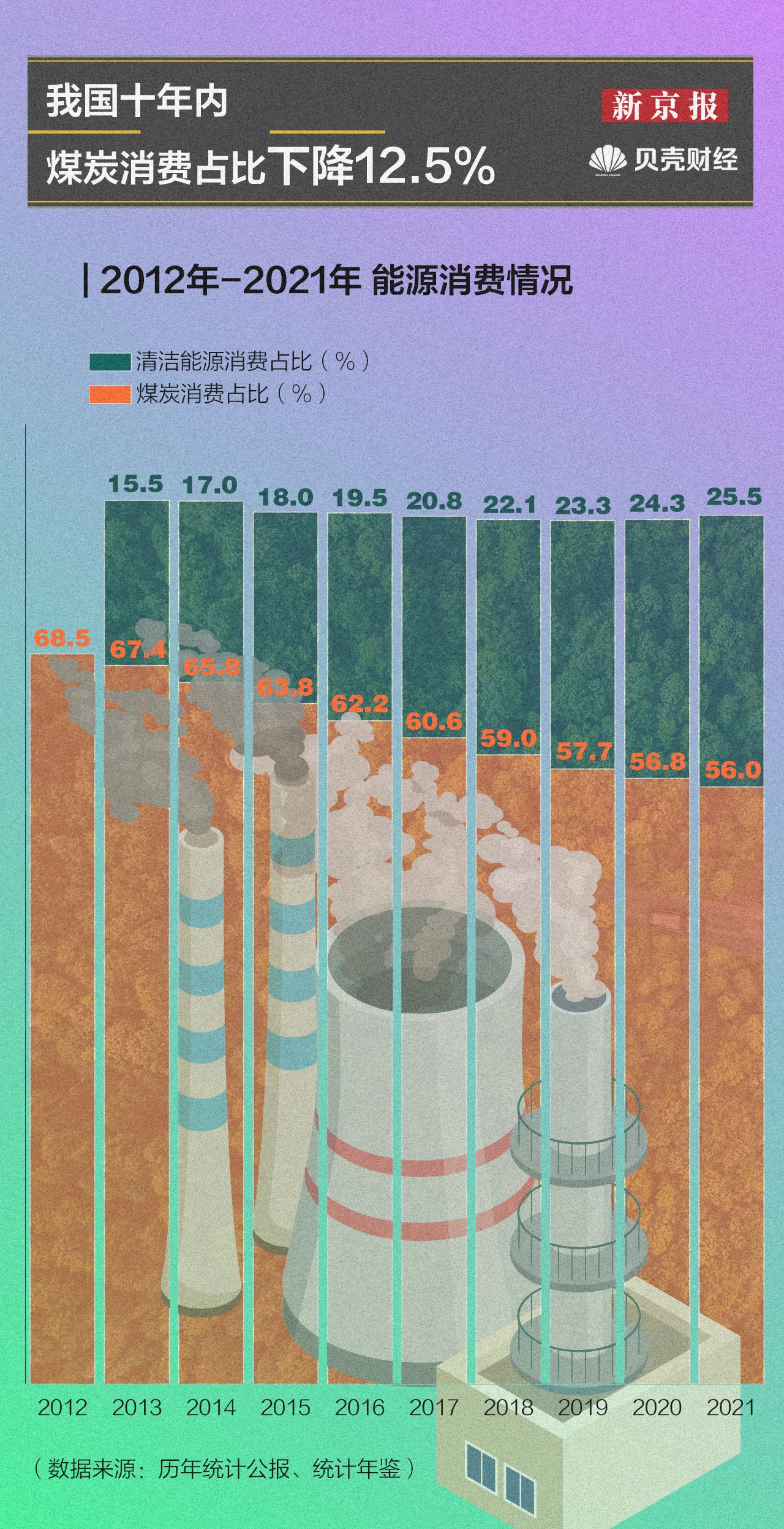 汪文斌在发布会上列举一组数据:煤炭消费比重下降到56%,是历史上下降最快的时期;非化石能源占比达到16.6%。数据显示,我国煤炭消费占比从2012年的68.5%下降至2021年的56.0%。同时,2021年清洁能源消费占比较2013年提高10.0%;2021年,天然气、水电、核电、风电、太阳能发电等清洁能源占比超过总量的四分之一。