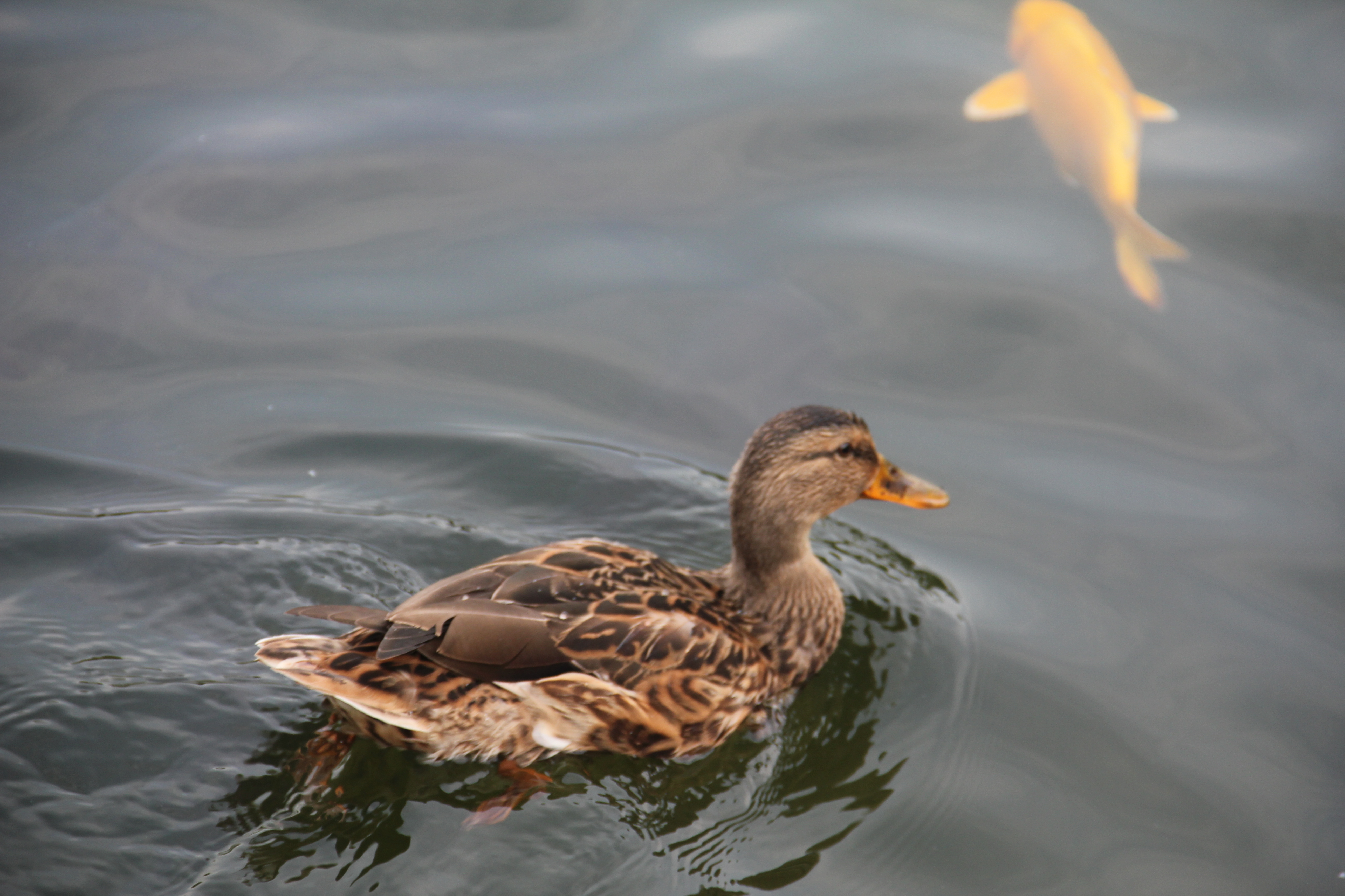 2022年9月10日,初秋的圆明园。野鸭子努力前游,是要追逐前面金黄的鱼儿吗?吴禹琛摄。