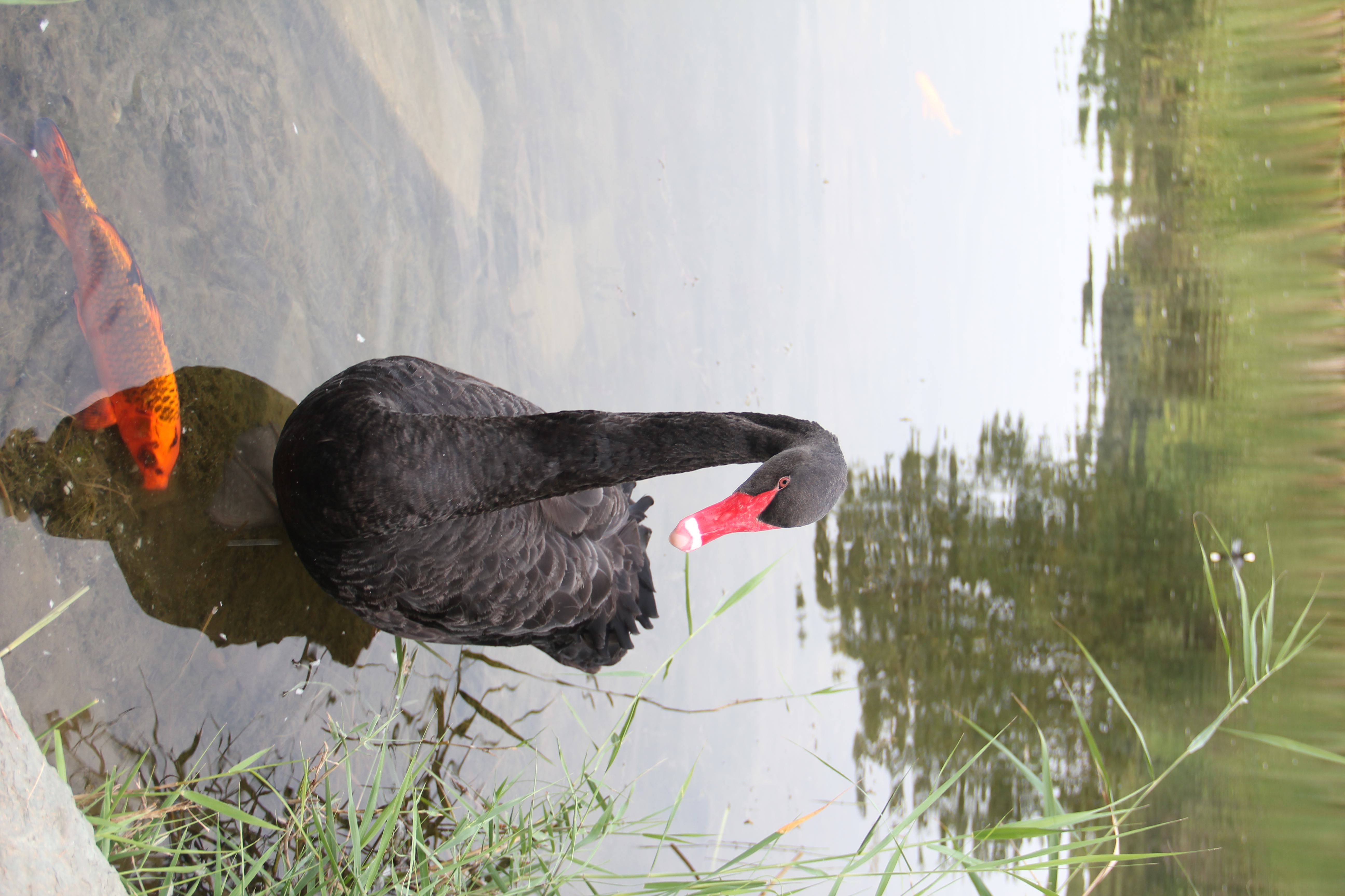 2022年9月10日,初秋的圆明园,黑天鹅悠然自得,与红色锦鲤相映成趣。吴禹琛摄。