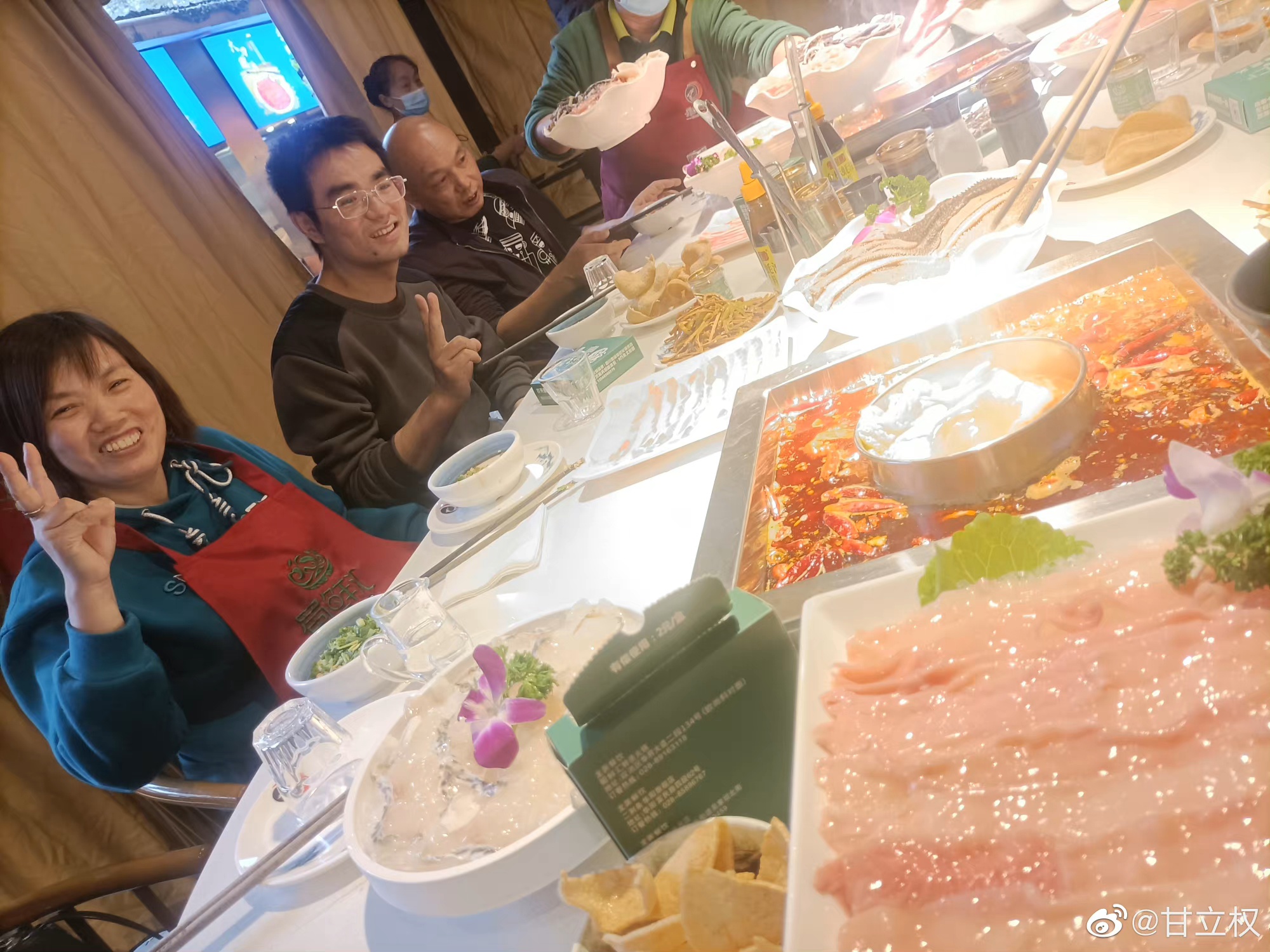 10月8日,甘宇(左二)出院后与家人、同事一起吃火锅。 受访者供图