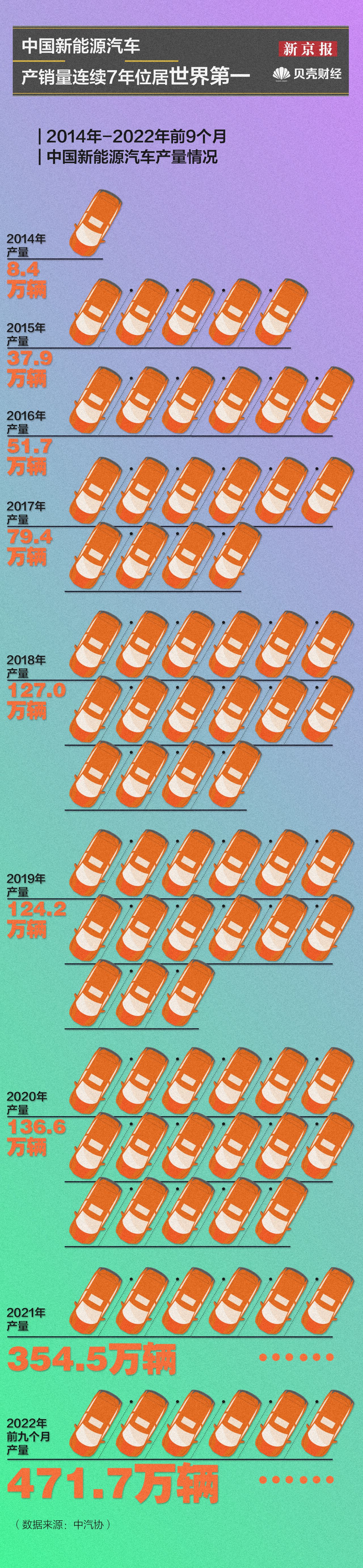 近十年,我国新能源汽车市场逐步扩大,新能源汽车产销量连续7年位居世界第一。2014年,我国新能源汽车产量仅为8.4万辆,销量为7.5万辆;2021年,其产销量同步翻倍增长,均超过250万辆。2022年,新能源汽车产销量再创新高,前九个月产量达471.7万辆,同比增长1.2倍,销量已达456.7万辆。此外,截至2022年9月,新能源汽车市场占有率已增至23.5%。