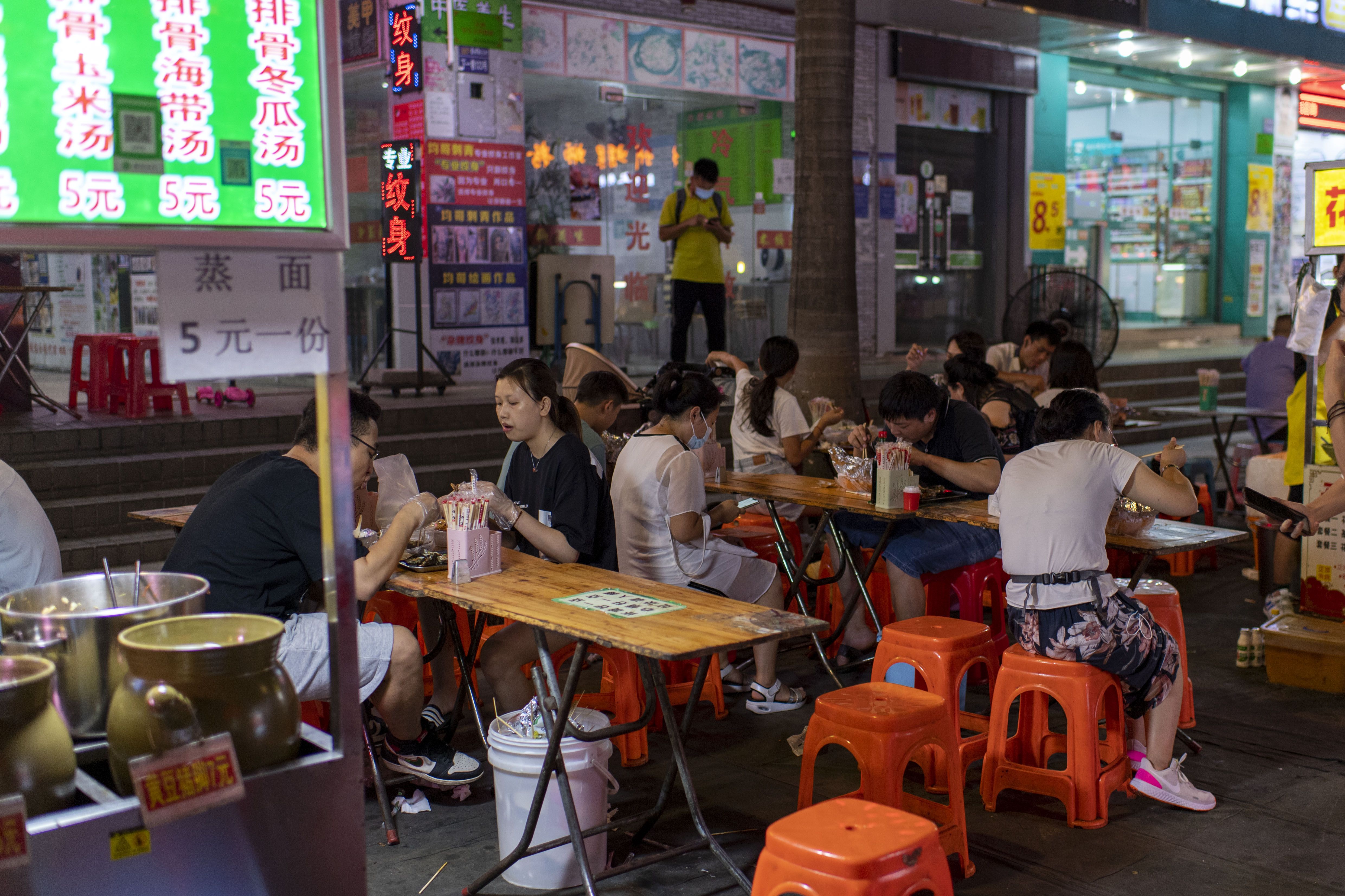 2020年8月10日,广东深圳,盐田街夜市46家小店开张,街上有了烟火气,不少食客正在享用美食。图/IC photo