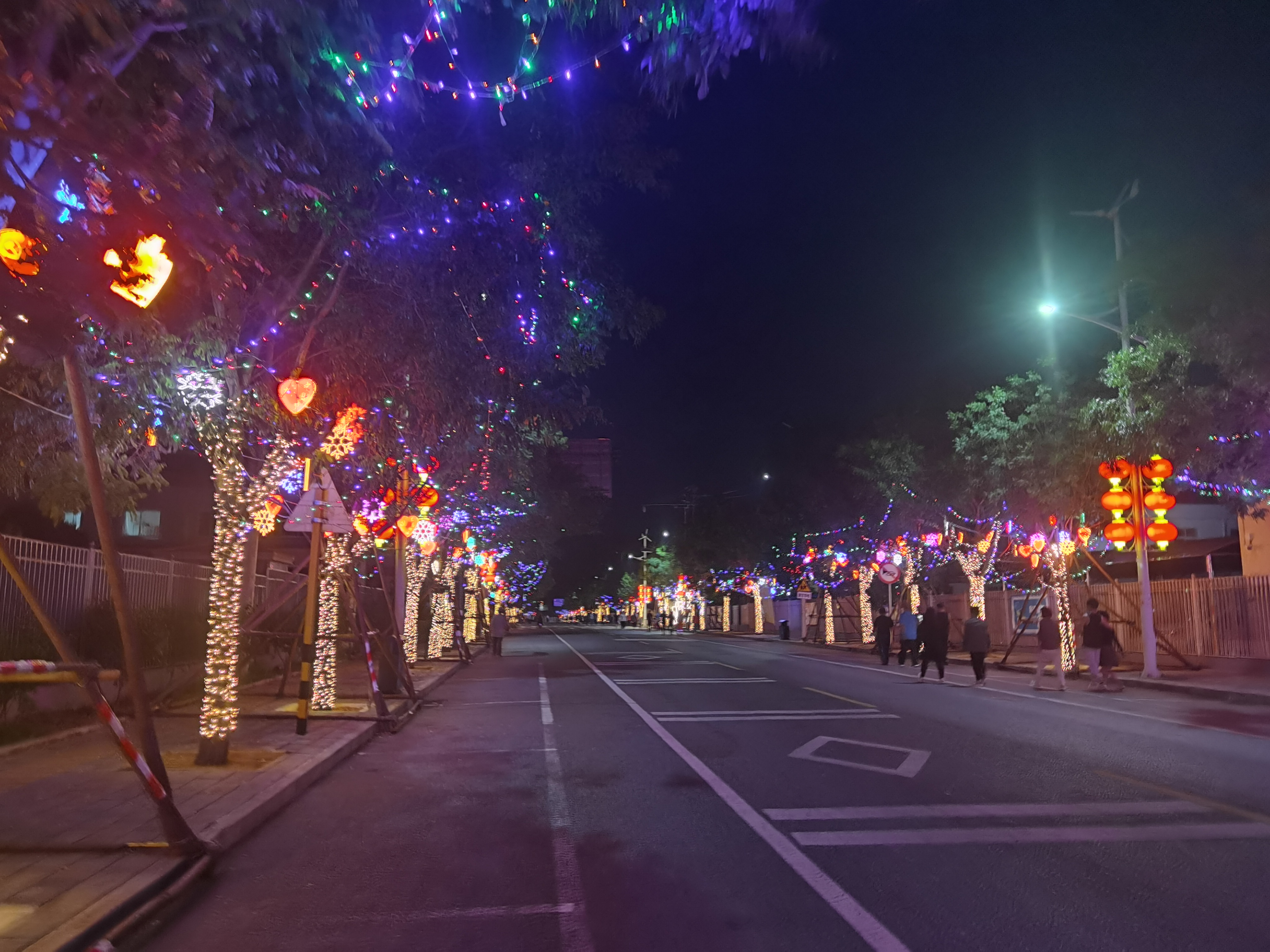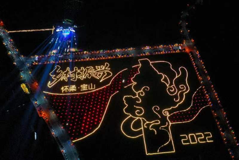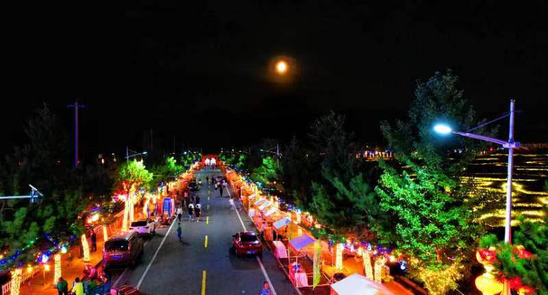 今年中秋国庆期间,怀柔宝山镇充分利用道路两排树木和稻田图案装扮主题彩灯,打造夜间灯光秀大道。怀柔区宝山镇供图