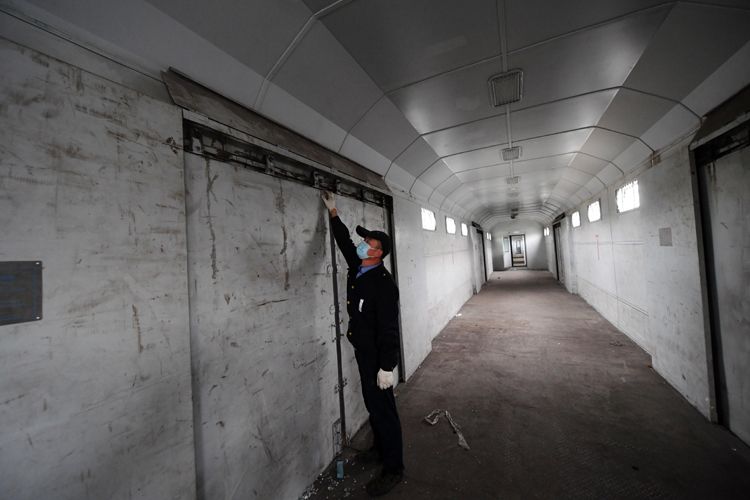 工作人员检查货运专列车厢。