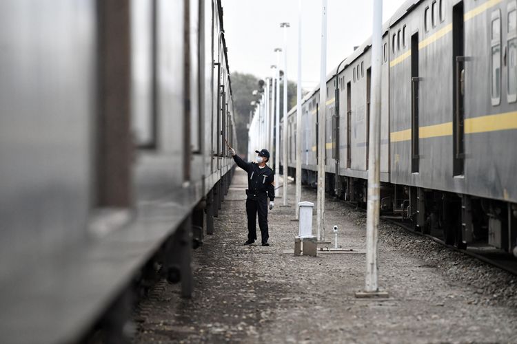 10月28日,黄村站,工作人员检查货运列车外观。据介绍,特快货物班列是专为零散白货、电商快递货物设计的,除高铁之外铁路最高运行速度等级的货物列车,具有高速准点、安全稳定、办理简便的特点,在中长距离白货运输方面优势明显,有效助力国内大循环。(注:“白货”是铁路领域专用术语,是指《铁路货物运输品名分类与代码表》中列举的除了煤炭、焦炭外的粮食、金属、食品、纺织、医药等品类物资。)