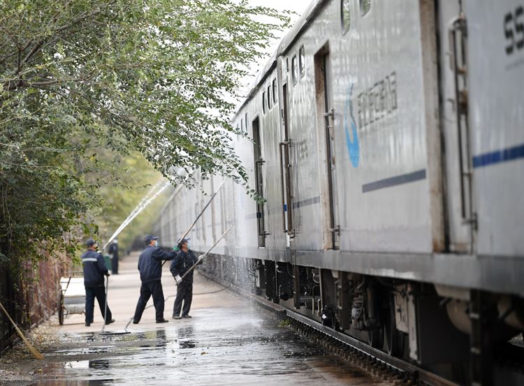 10月28日,黄村站,工作人员清洗货运专列。北京车辆段相关负责人介绍,班列开行8年来,该段共检修保障44800列车安全运行。