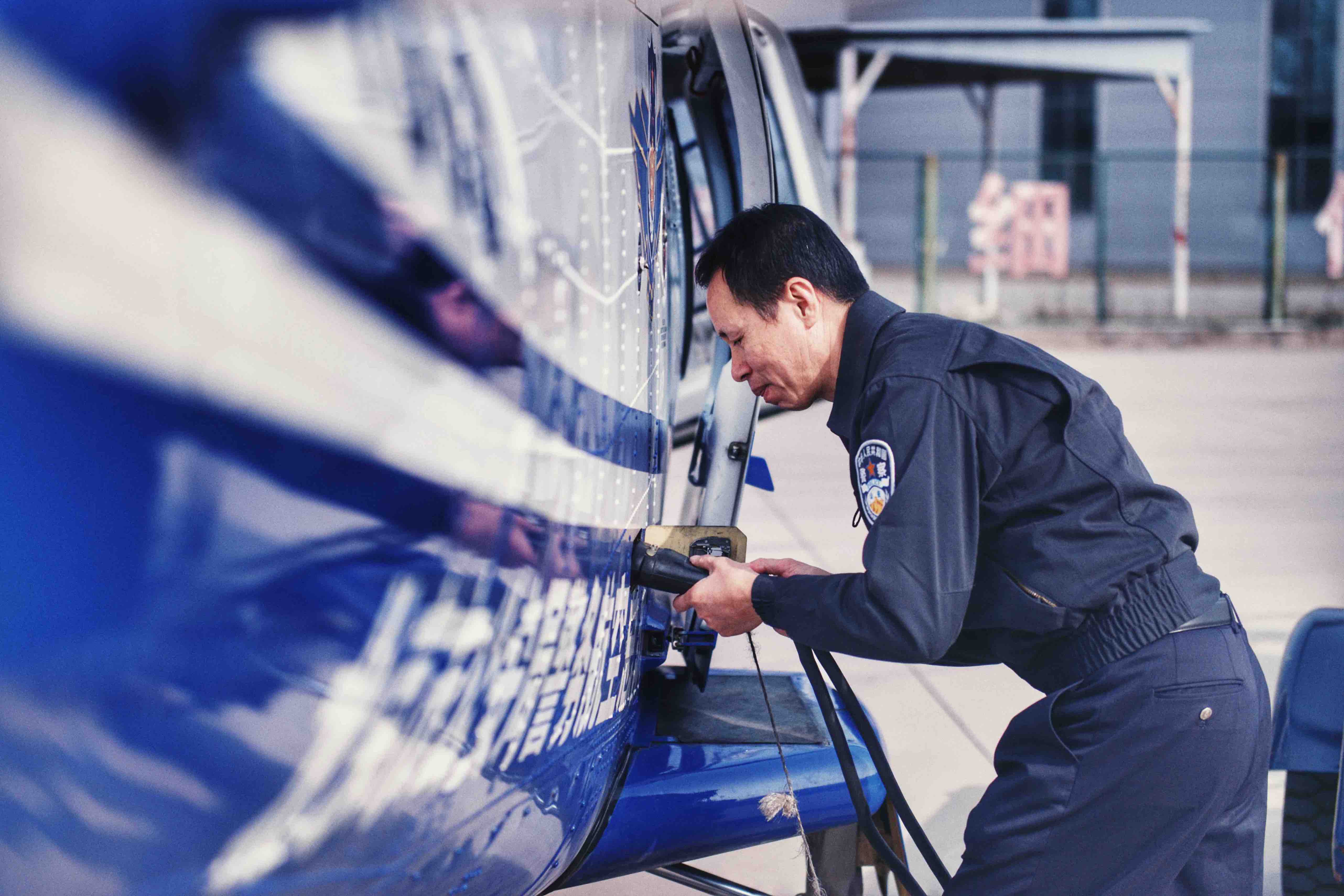 薛红立就是老陈亲自从中国民航飞行学院飞行器动力工程专业招来的徒弟。飞机从机库拉出,到滑出起飞、降落维护,每一个环节,机务人员都要全程监督、紧密跟踪,他们是最早开启机库门、最晚离开的一组人。薛红立2014年来到机务大队工作,目前是总队唯一一台109SP改进机型的主责机械师,尽管他最初的梦想, 是制造飞机。