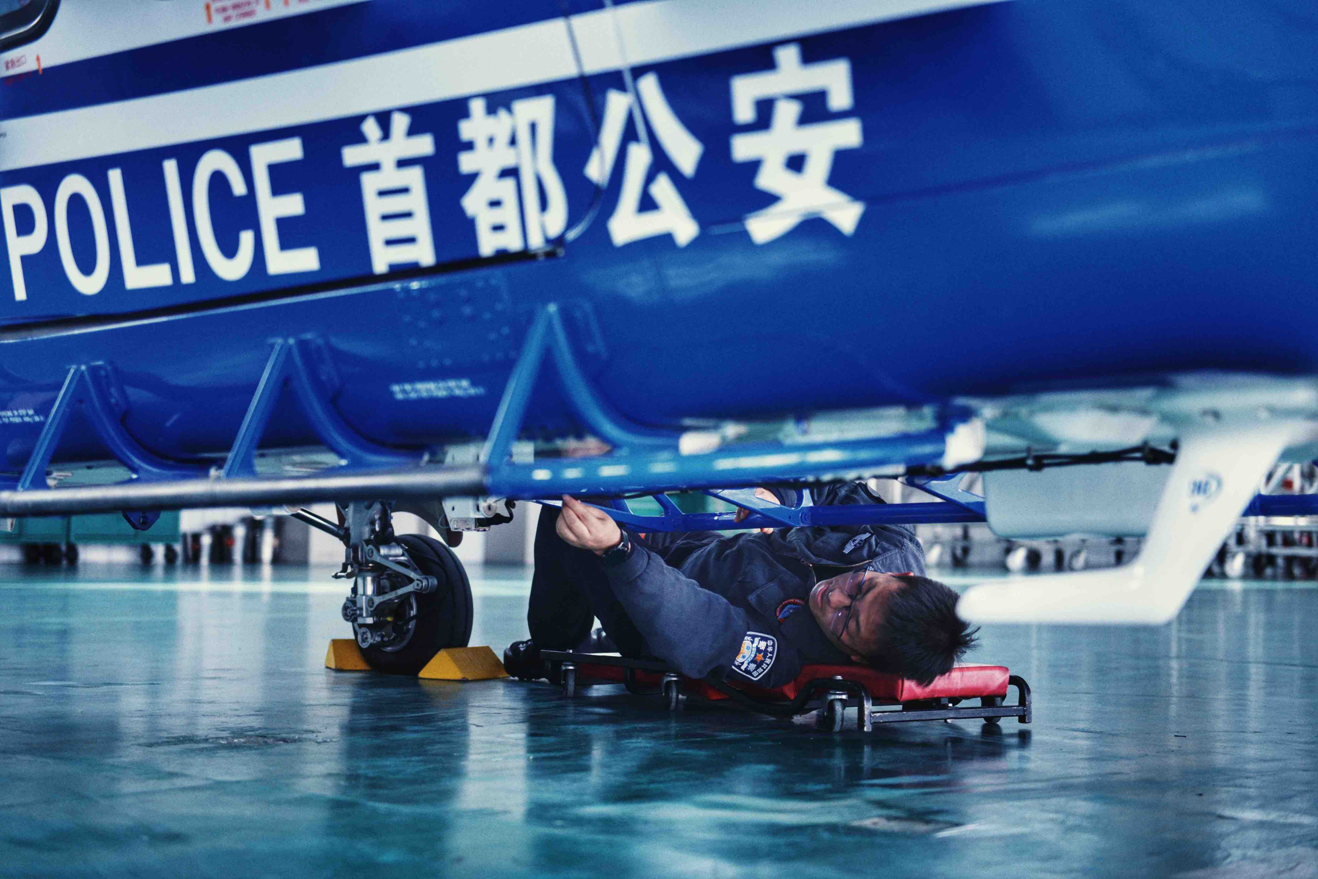 薛红立在检查职责飞机的机械安全。 北京市公安局警务航空总队 格林 摄