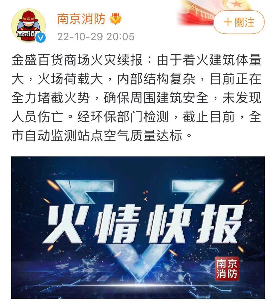 20时5分,南京消防官方微博发布消息,金盛百货商场火灾续报:由于着火建筑体量大,火场荷载大,内部结构复杂,目前正在全力堵截火势,确保周围建筑安全,未发现人员伤亡。经环保部门检测,截至目前,全市自动监测站点空气质量达标。