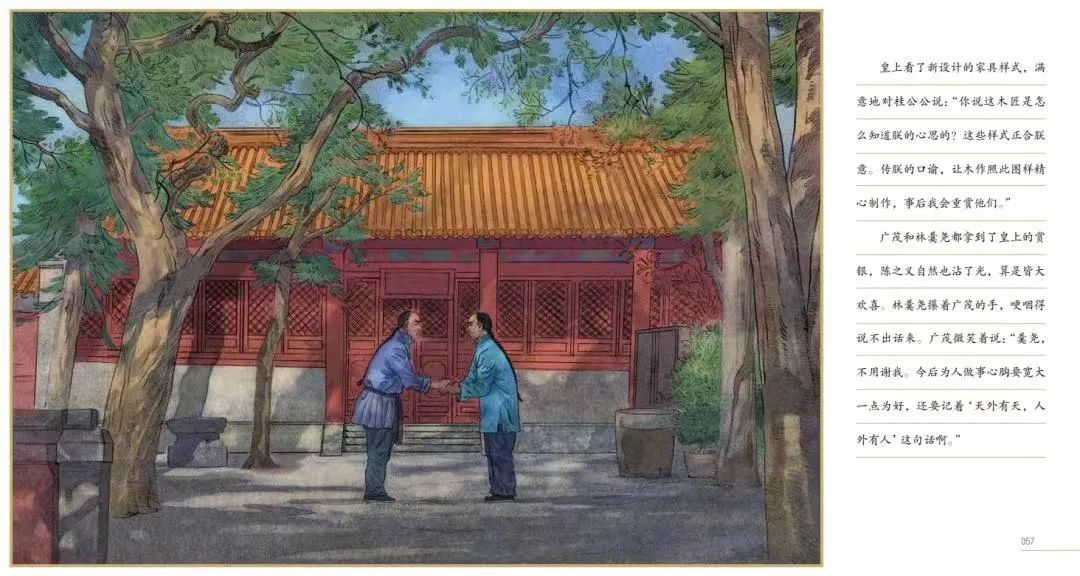 这是“中华匠人精神传奇故事图画书”系列中的第6册,此前已出版的有《大茶庄》《烤鸭王》《火锅王》《大鞋匠》和《大药房》。分别涉及花茶制作、烤鸭技艺、铜锅涮肉、传统布鞋和中华医药等非遗项目,这本书中的家具制作技艺也出自国家级非物质文化遗产名录。