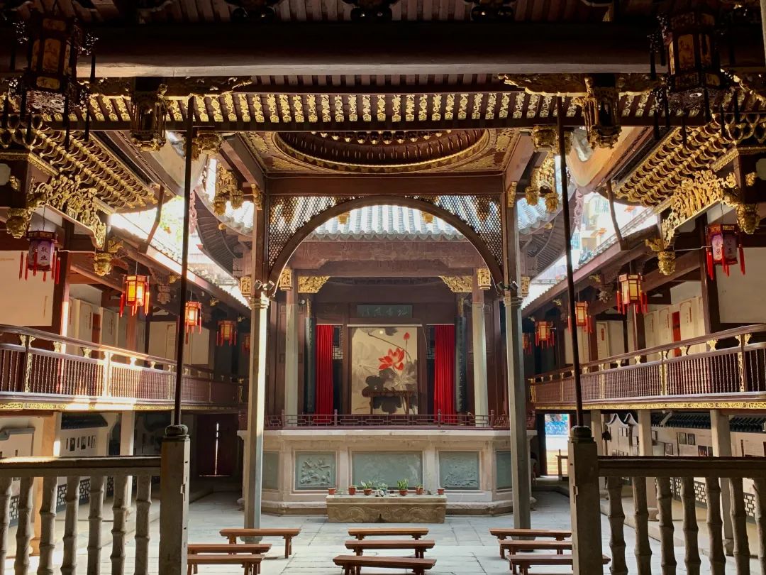 在今日的上下杭历史街区西侧,我们可以欣赏到这座汇聚古田商帮心血的杰作。红砖砌成的“五岳朝天”式大门镶嵌“古田会馆”横匾,其上还有蟠龙“天后宫”直匾。妈祖是福建的标志性信仰对象,故闽籍会馆多具备“天后宫”身份,古田会馆也不例外。步入大门,正对着殿堂的是内设藻井的歇山戏台,两侧为看戏楼,靠近殿堂的一端做了飞檐翘角、斗拱繁复的钟鼓楼。在钟鼓楼之间是檐下雕饰描金的拜亭,与钟鼓楼恰成檐牙高啄、勾心斗角之势,拜亭顶端的藻井正心一朵金莲绽开,灿若繁星的涂金斗拱逐层环绕展开。古田会馆的第三个大藻井位于殿堂正中,两侧是黑漆绘金色凤凰的天花板。除了处处精湛的木雕、石雕,殿堂本身的结构也值得一观,它不仅用了福州晚期大型建筑常用的减柱造,更是用了“悬梁吊柱”的特殊构造,仿若苏州“花篮厅”一般,精巧绝伦。宏大精美的会馆,是一邑乃至一省绅商在省城的体面。除了古田会馆之外,隶属浙江的安澜会馆和广东会馆也是福州会馆中的佼佼者,与古田会馆不同的是,它们采用的是各自省份的建筑风格,也为福州历史建筑增添了别样的色彩。古田会馆张继州摄。