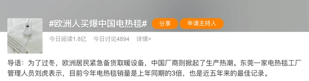 2、共青团中央:《月销10万!欧洲人买爆中国电热毯》;