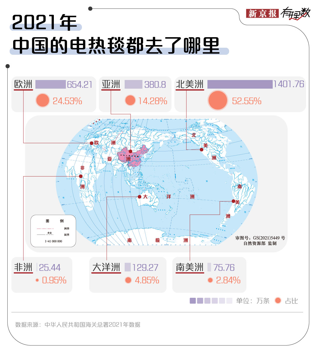 尽管欧洲进口了很多中国的电热毯,但是从往年的出口订单来看,北美洲才是中国电热毯的进口大户。以2021年的数据为例:中国电热毯超过一半都出口到了北美洲。