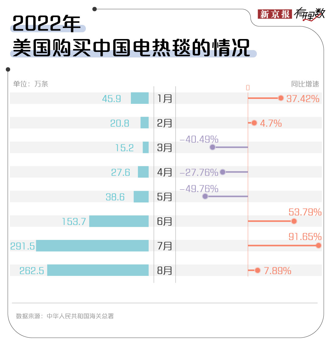 虽然今年3-5月份,同比增长为负,但是进入6月份便开始加速采购中国的电热毯。7月,同比增速同样超过了90%。而且,今年美国前八个月进口中国电热毯的数量是整个欧洲的两倍还多。