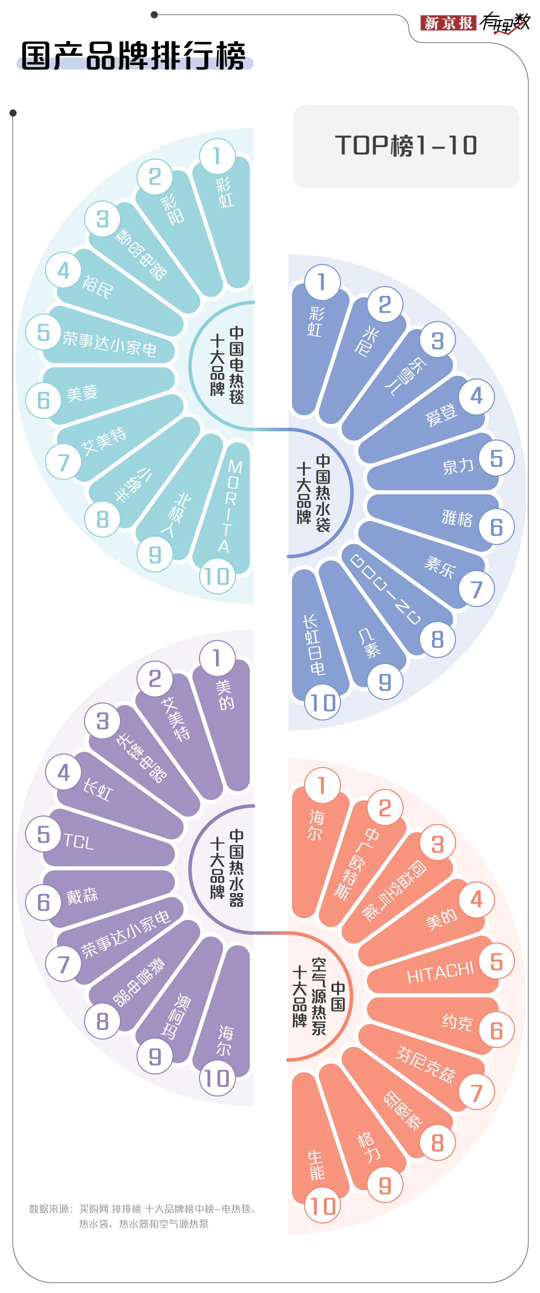 反观中国的消费者,热水袋,电热毯似乎已经是过时的御寒产品,至于取暖器和空气源热泵,可能大家也并不是很熟悉这些领域。我们结合行业知名度和影响力、企业规模和经济实力,梳理了国产品牌榜单。其中彩虹集团的电热毯和热水袋,都处于行业领先的水平。同时,美的的热水器和海尔的空气源热泵,也都有各自的优势。