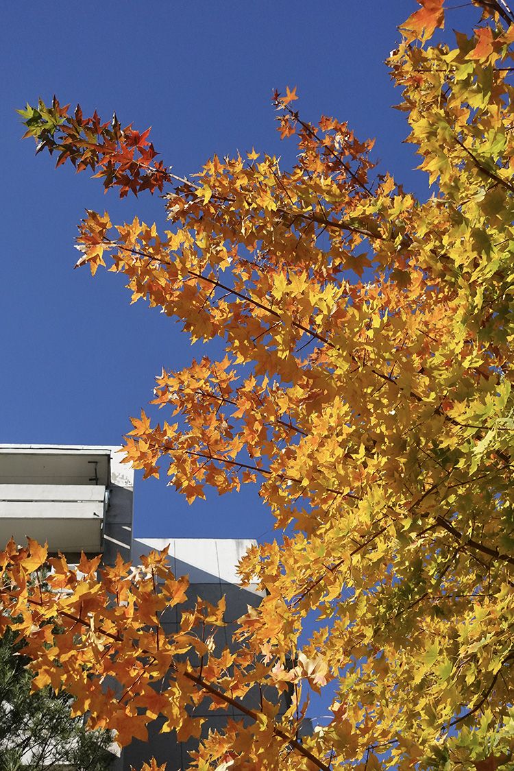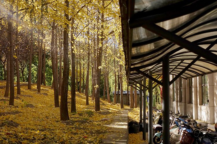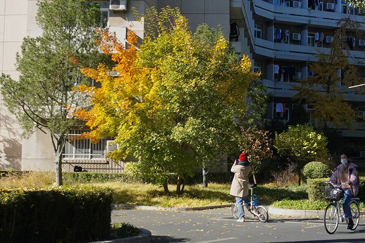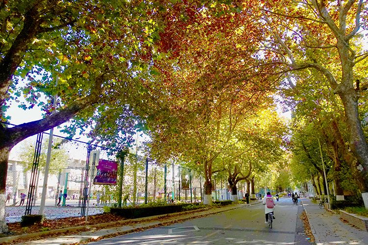 走在校园林荫道,头上是五彩斑斓的秋叶。