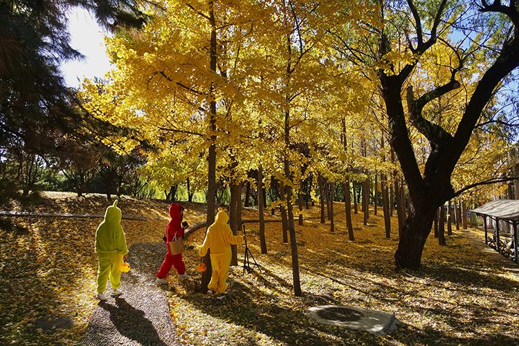 路边的枫叶呈五彩之色,学生驻足拍照。