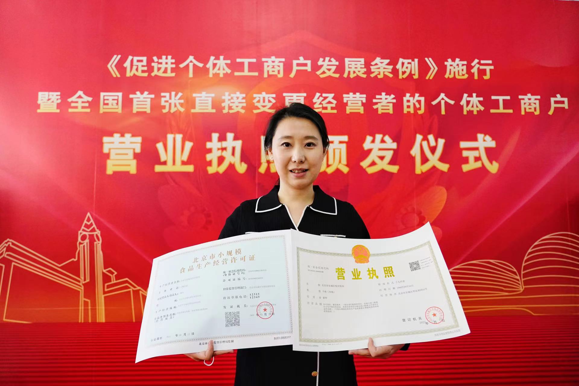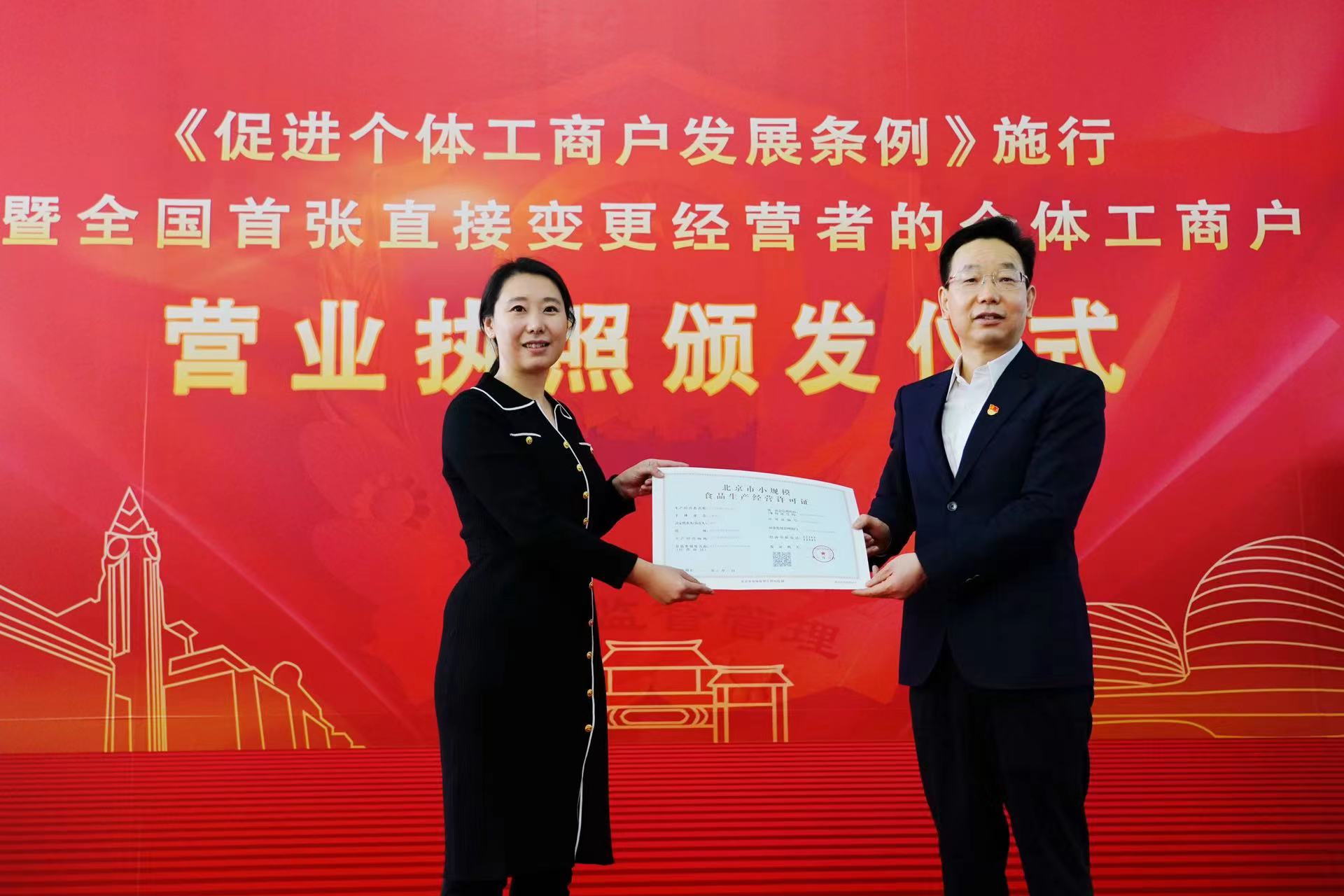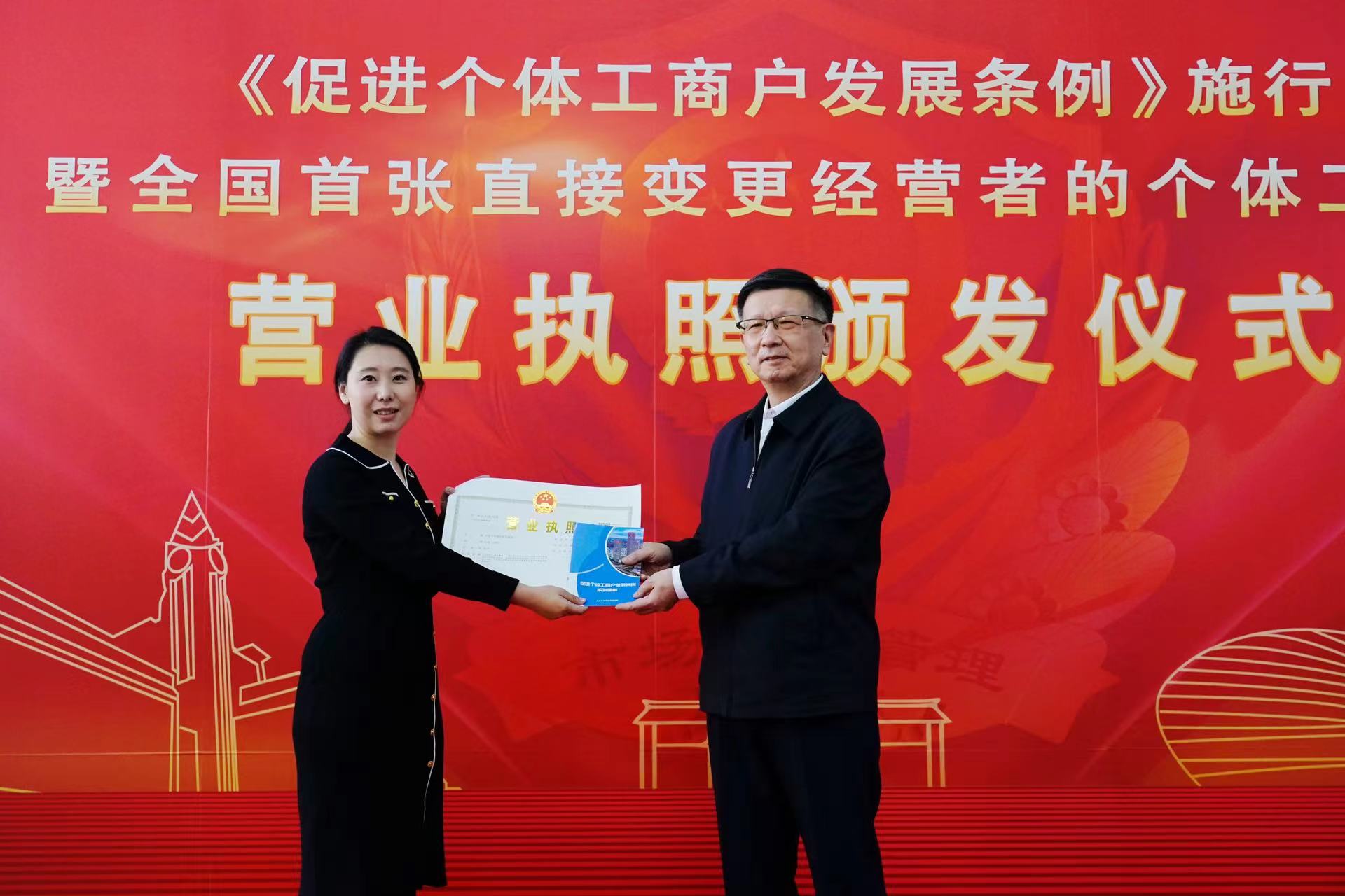 新京报讯(记者陈琳)《促进个体工商户发展条例》(以下简称《条例》)于11月1日起施行。今天下午,在东城区政务服务中心,市场监管总局党组成员、副局长蒲淳向北京市东城区悦宾饭馆经营者郭华颁发了《条例》实施后全国首张直接变更经营者的个体工商户营业执照。